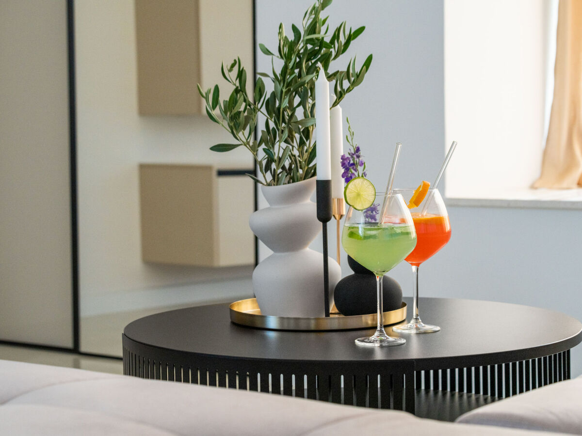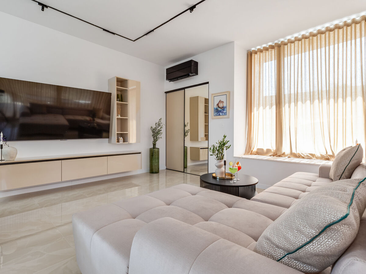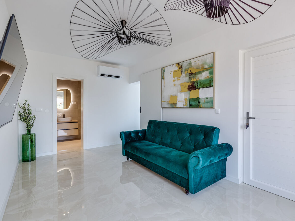 En 2025, aménagement très moderne: grand séjour/salle à manger avec 1 divan-lit (140 cm, longueur 200 cm), TV (satellite).