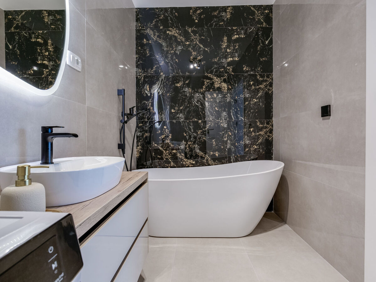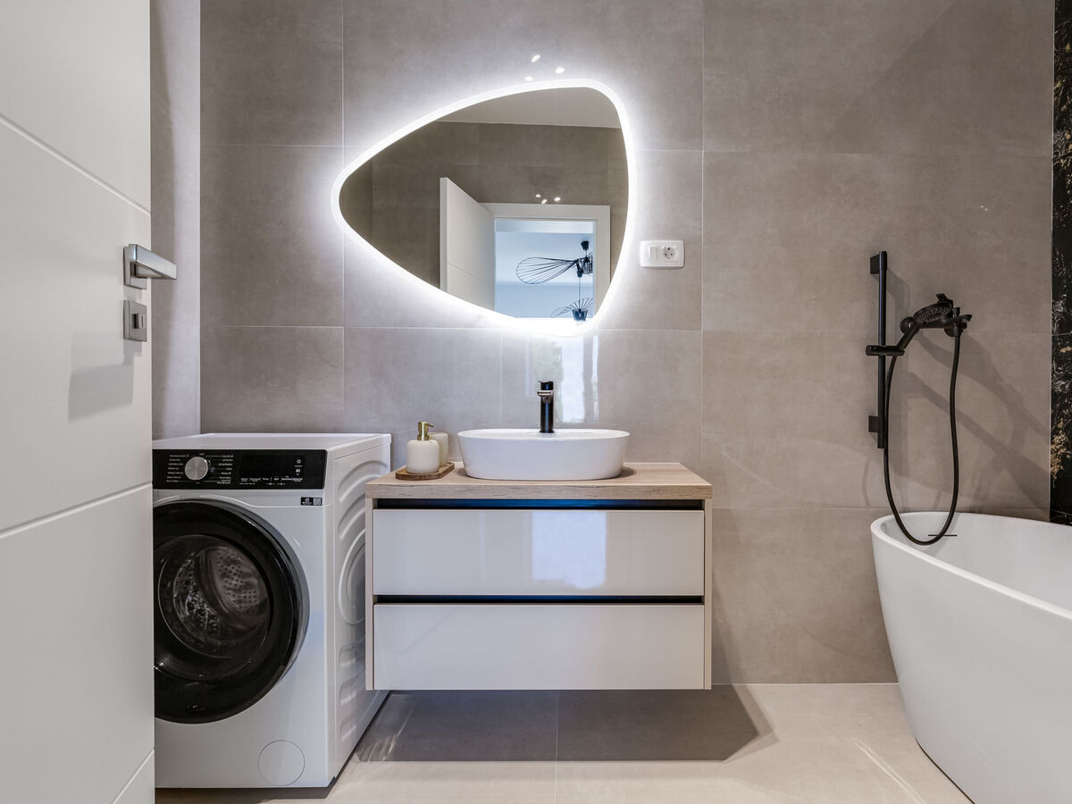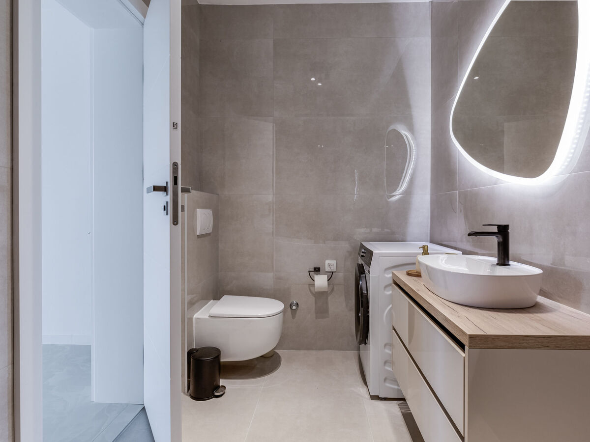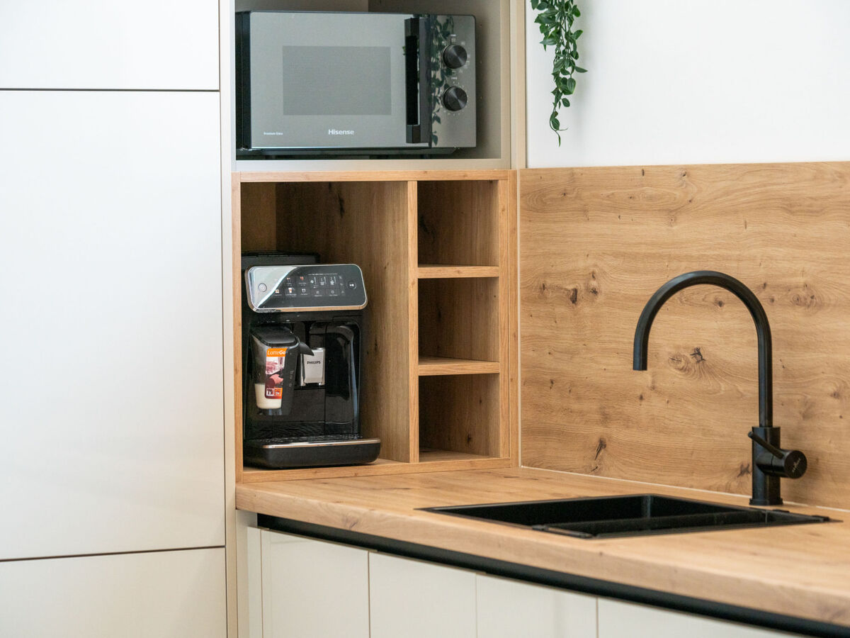 Cuisine ouverte (four, lave-vaisselle, 4 plaques à induction, grille-pain, bouilloire électrique, micro-ondes, congélateur, cafetière électrique).