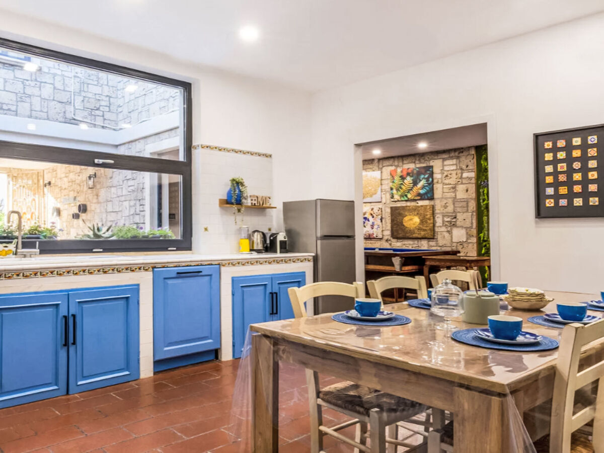 Cuisine (4 plaques de cuisson, four, lave-vaisselle, micro-ondes, cafetière électrique) avec table pour les repas.