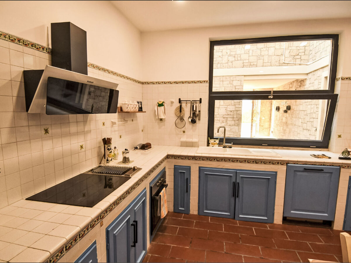 Cuisine (4 plaques de cuisson, four, lave-vaisselle, micro-ondes, cafetière électrique) avec coin repas.