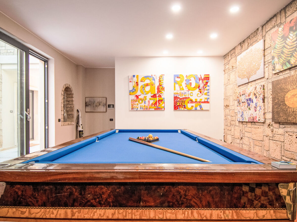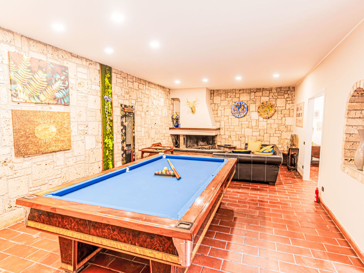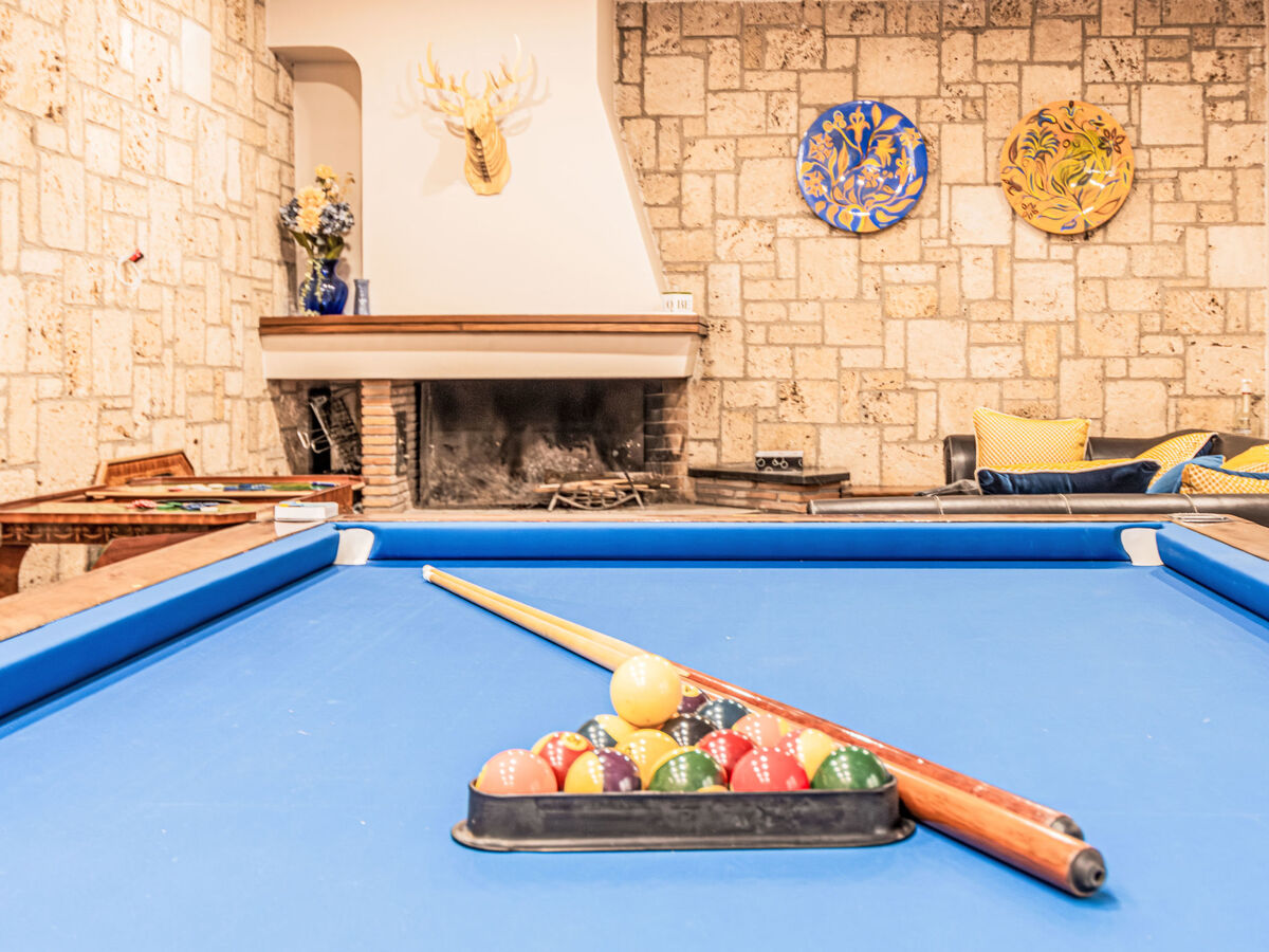 Aménagement moderne et de style: salle de billard avec cheminée, TV et écran plat.