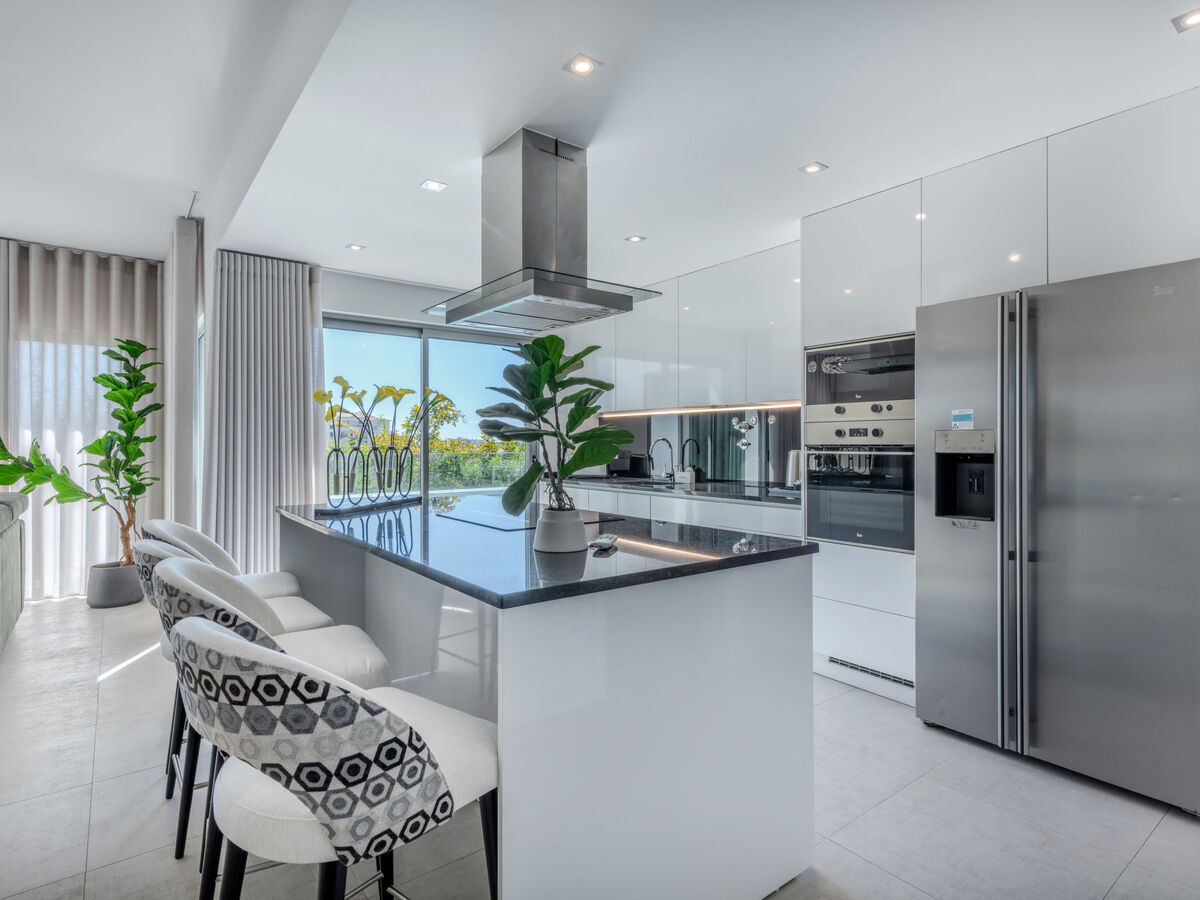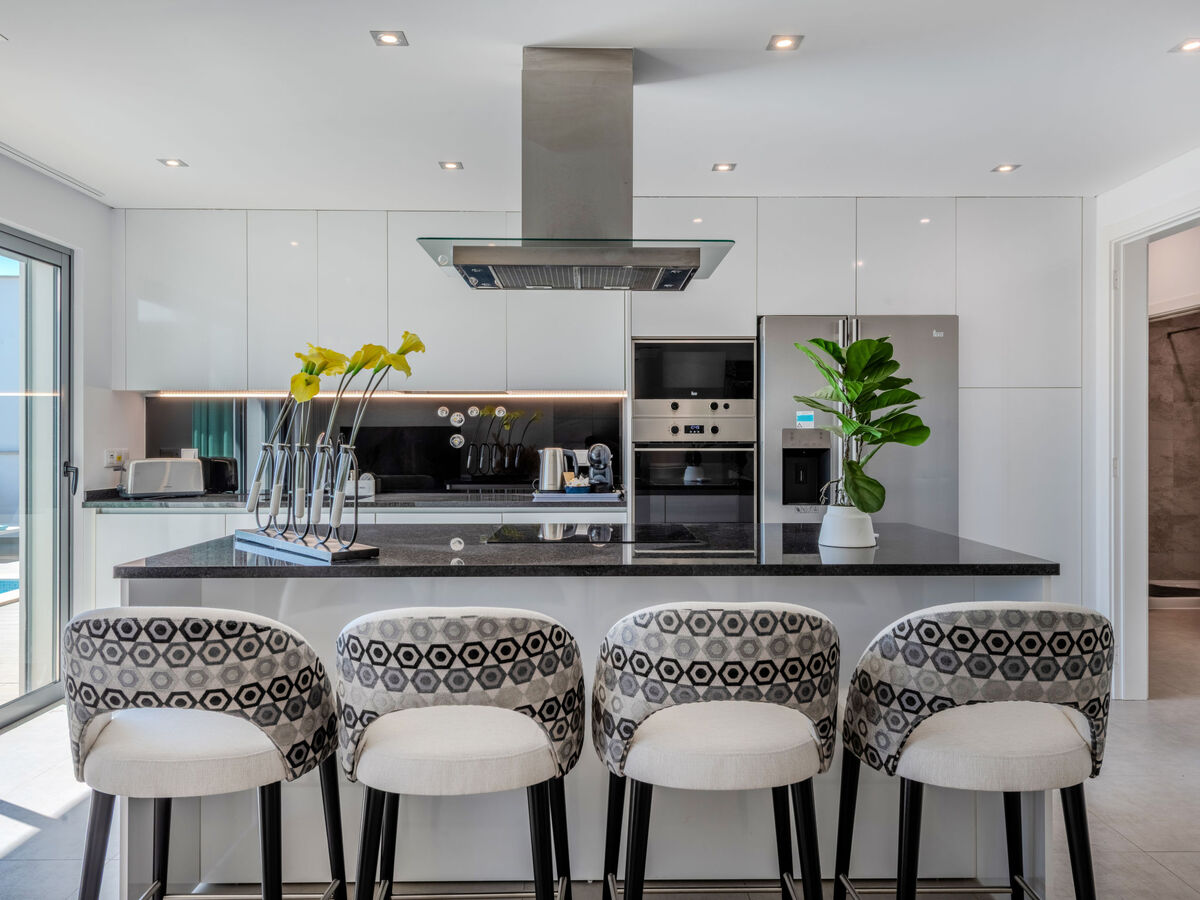 Cuisine ouverte (four, lave-vaisselle, 4 plaques vitrocéramiques, grille-pain, bouilloire électrique, micro-ondes, congélateur).