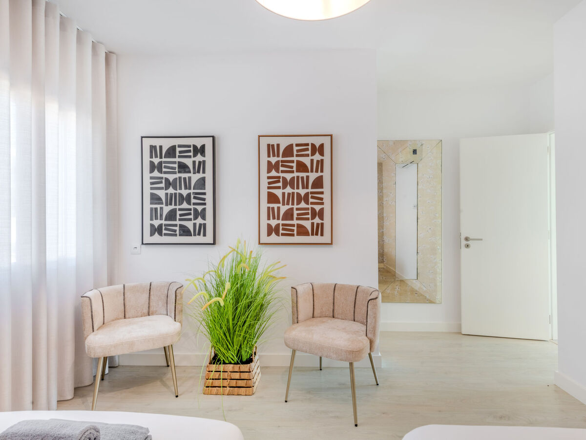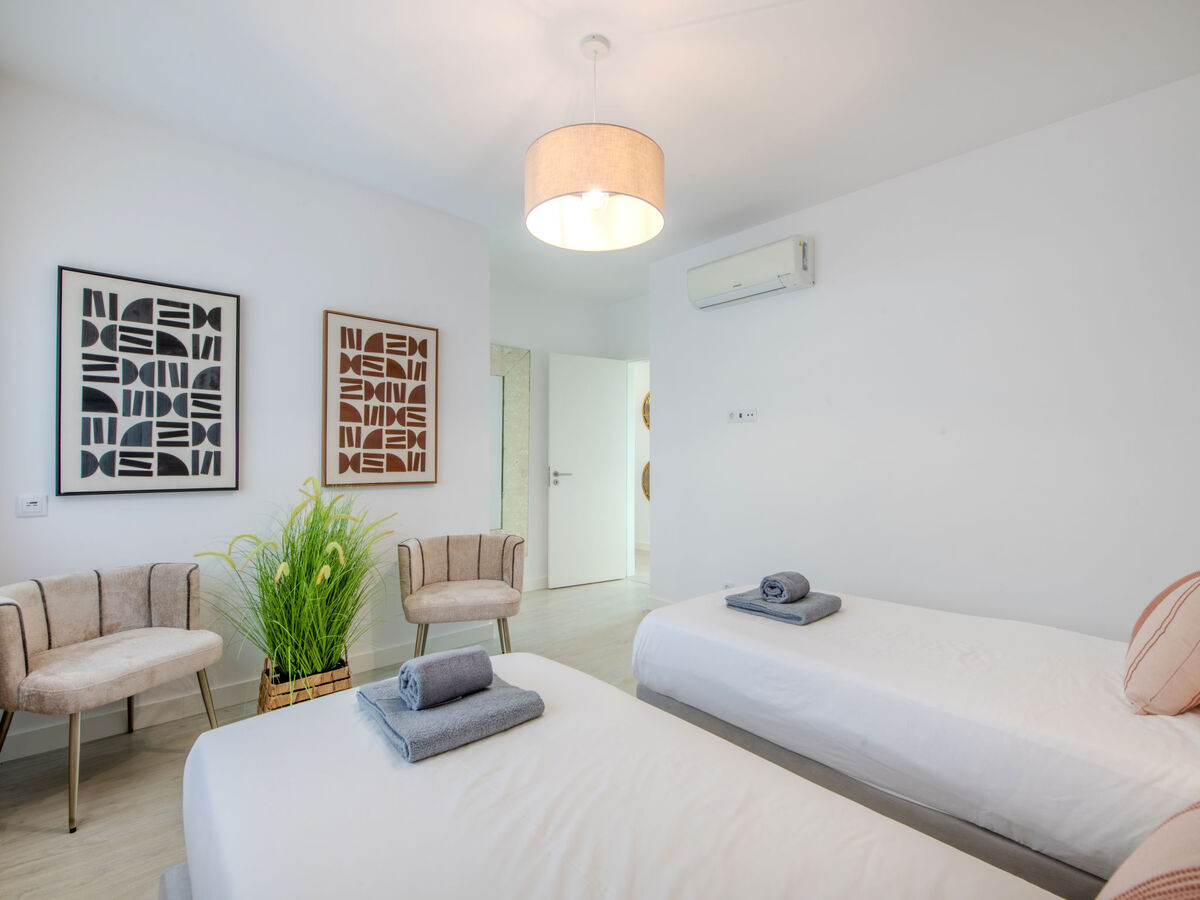 1 chambre avec 2 lits (90 cm, longueur 200 cm), air-conditionné et chauffage à air chaud.