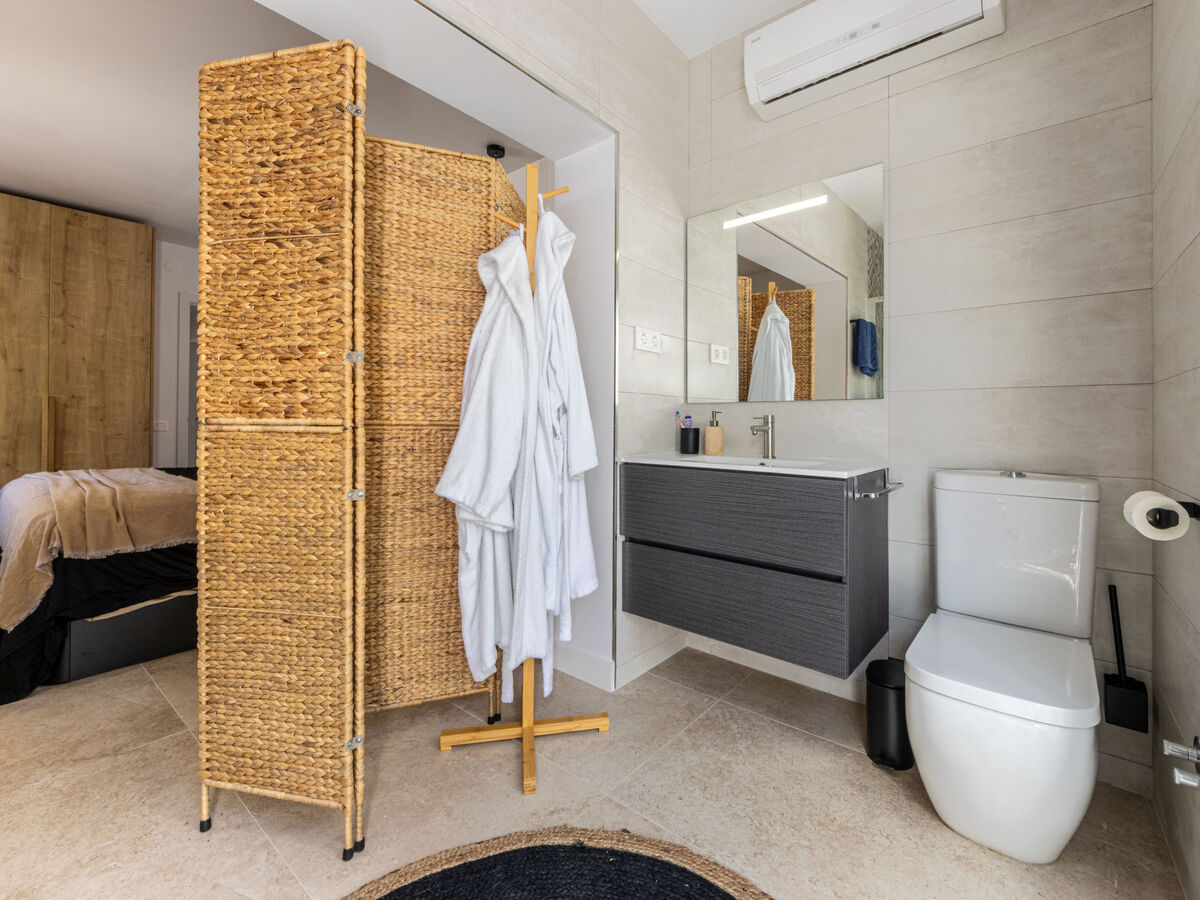 1 chambre avec 1 grand-lit (160 cm, longueur 190 cm), douche/WC.