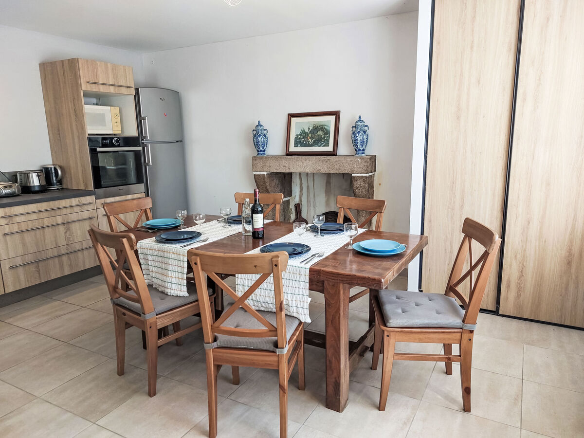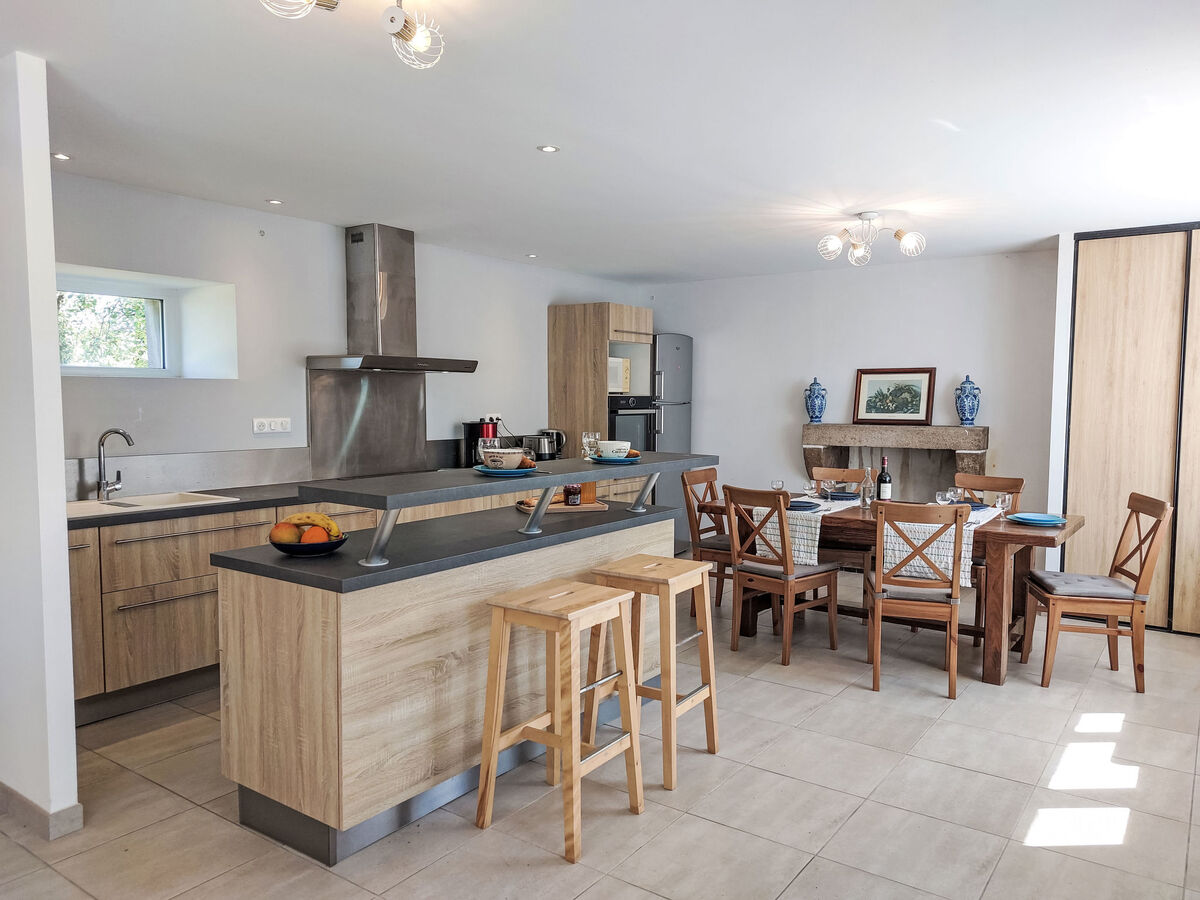 Grande cuisine ouverte 30 m2 (four, lave-vaisselle, 3 plaques à induction, grille-pain, bouilloire électrique, micro-ondes, congélateur, cafetière électrique) avec bar, table pour les repas.