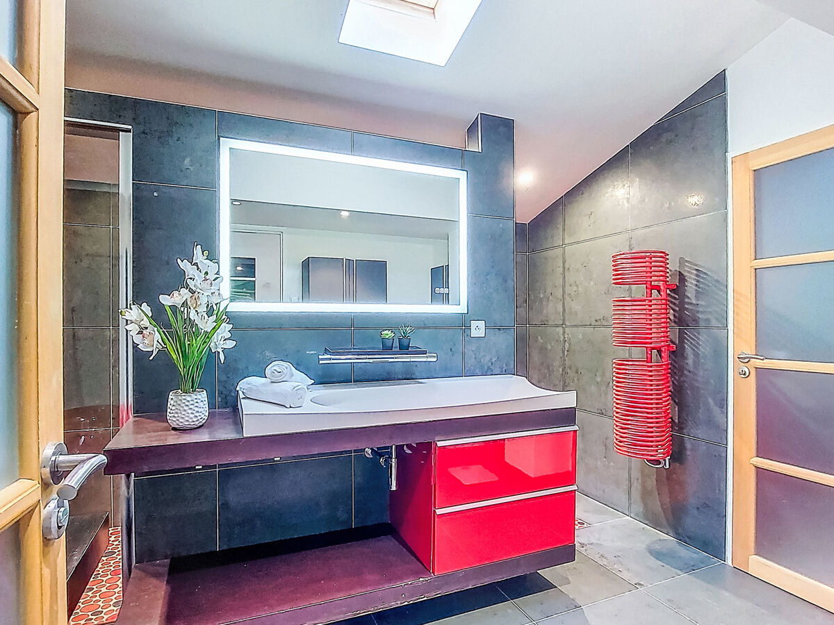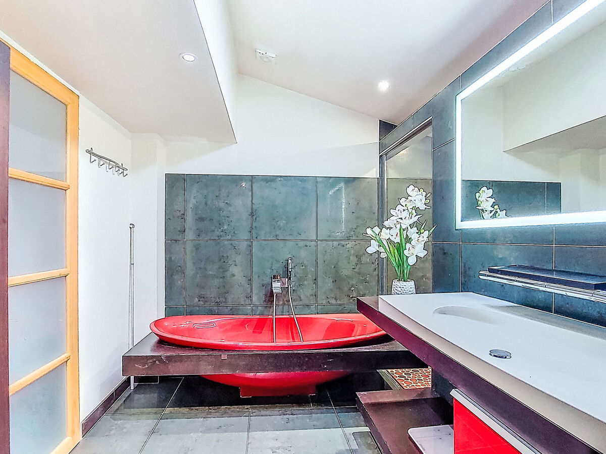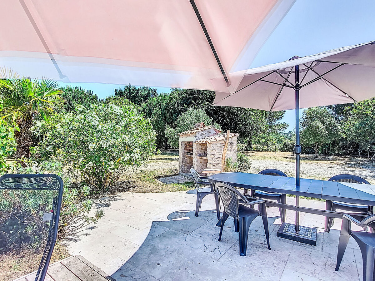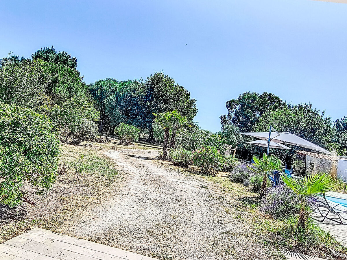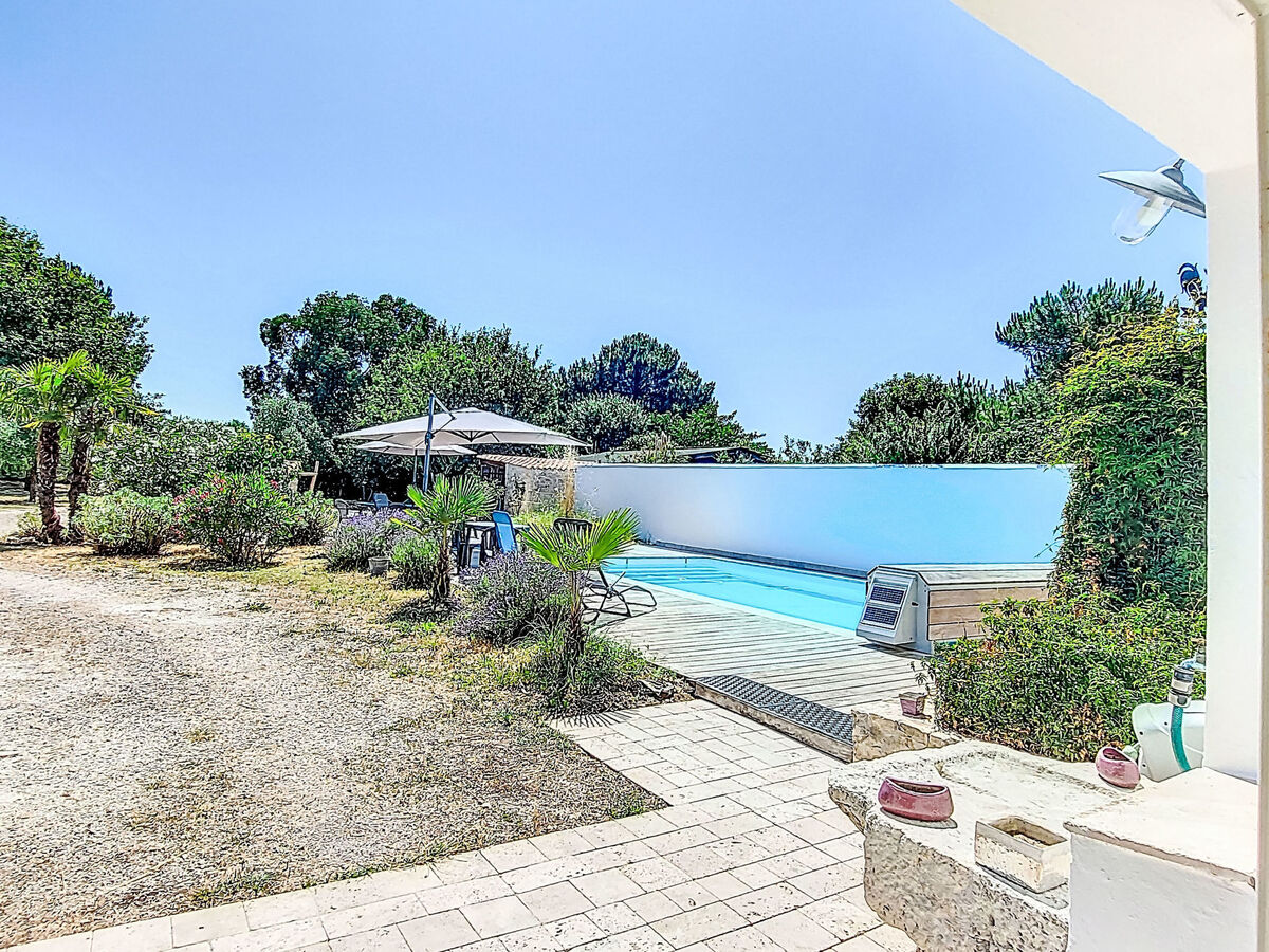 Pool house avec douche et WC, terrasse, meubles de jardin, espace barbecue, place de parking, garage individuel.