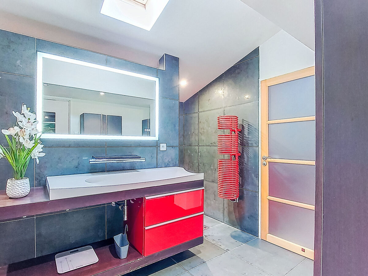 1 chambre, mansardée avec 1 lit (90 cm, longueur 190 cm), 1 grand-lit (1 x 140 cm, longueur 190 cm), douche/WC.