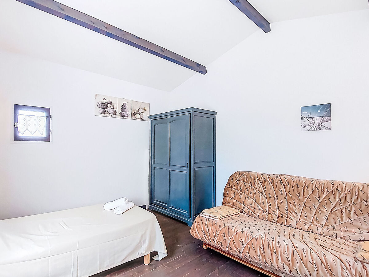 À l'étage supérieur: (escalier extérieur) séjour/chambre à coucher avec 1 grand-lit (1 x 120 cm, longueur 190 cm).