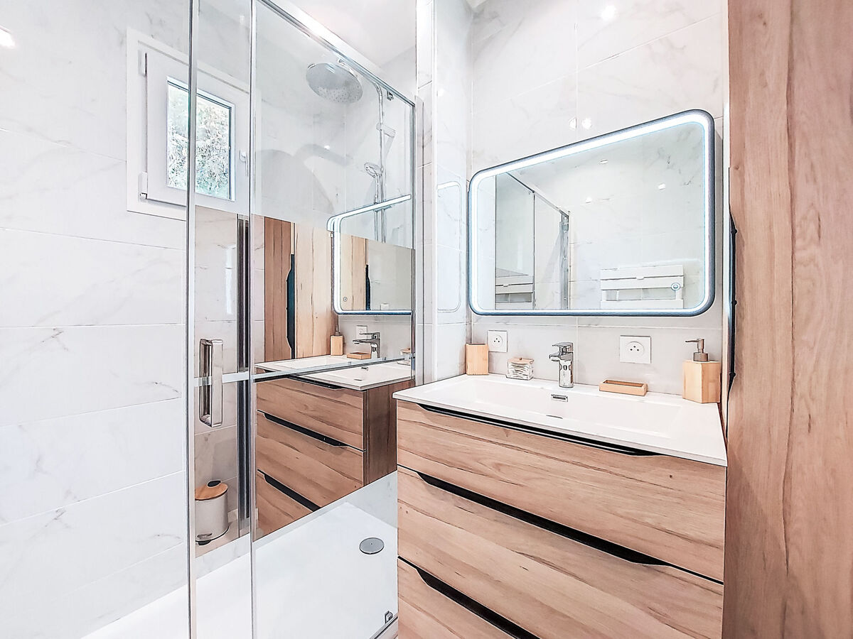 Cuisine ouverte (four, lave-vaisselle, 4 plaques à induction, grille-pain, bouilloire électrique, micro-ondes, congélateur, cafetière électrique).