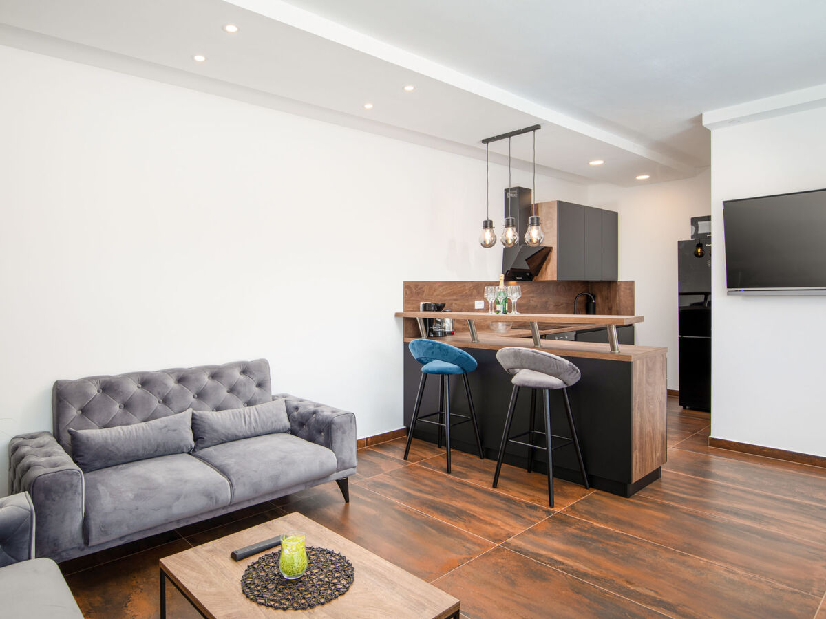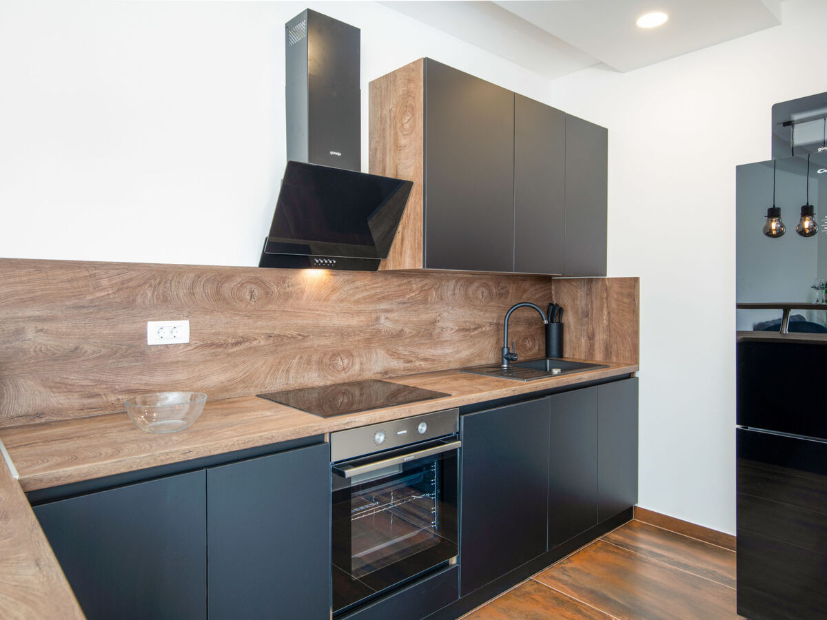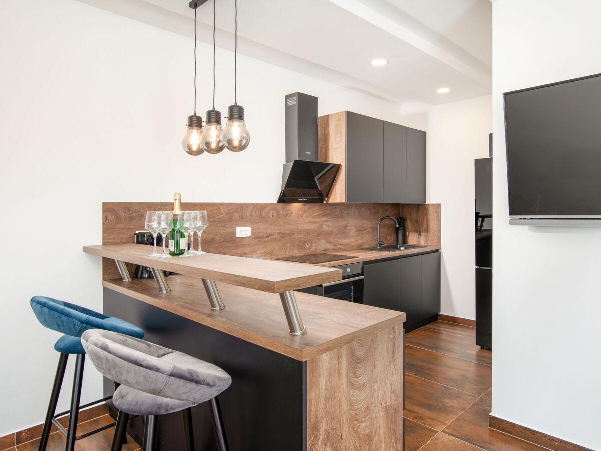 Cuisine ouverte (four, lave-vaisselle, 4 plaques vitrocéramiques, grille-pain, bouilloire électrique, congélateur, cafetière électrique).