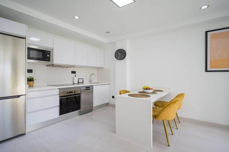 La cuisine ouverte est entièrement équipée avec plaques vitrocéramiques, réfrigérateur, congélateur, micro-ondes, lave-vaisselle et tous les ustensiles nécessaires, dont une cafetière, une bouilloire, un grille-pain et un presse-agrumes, pour une préparation des repas simple et agréable.