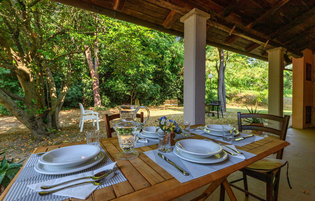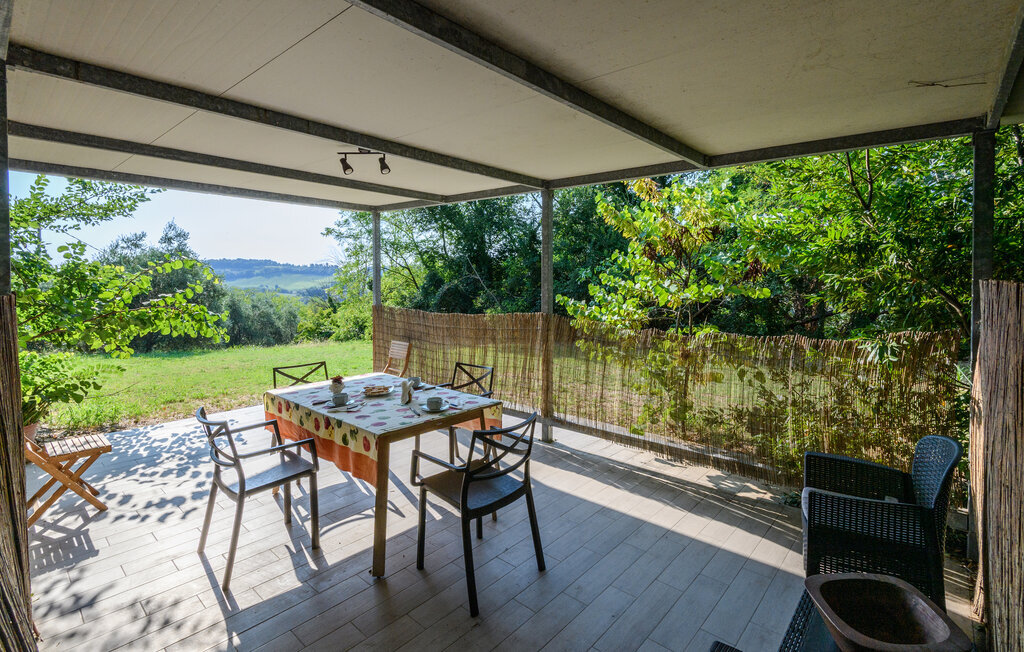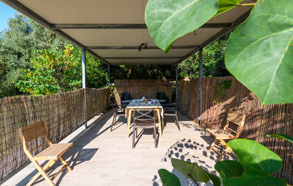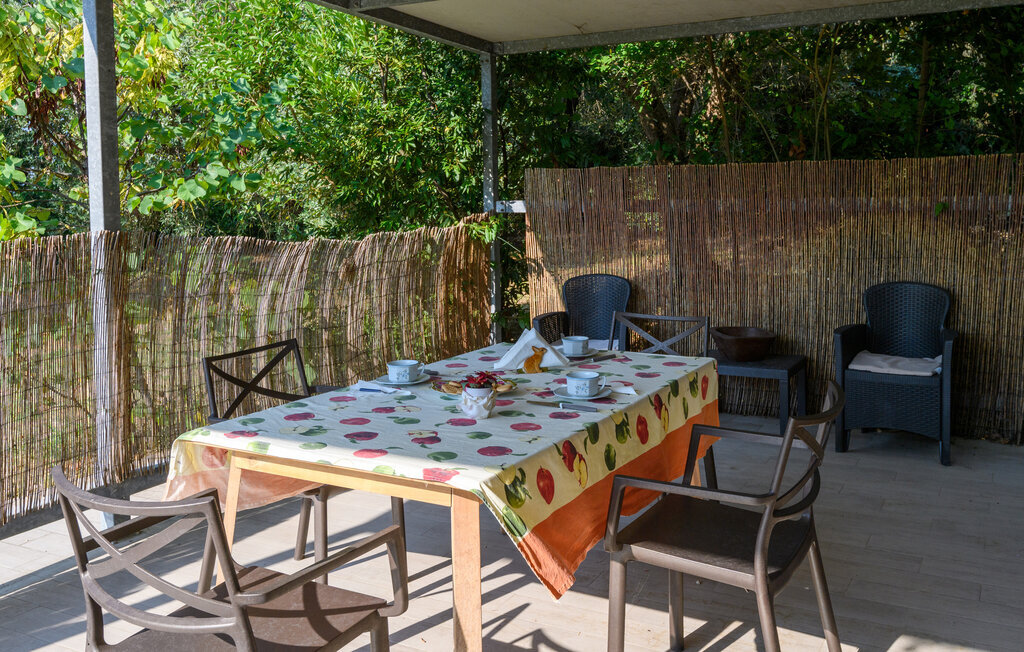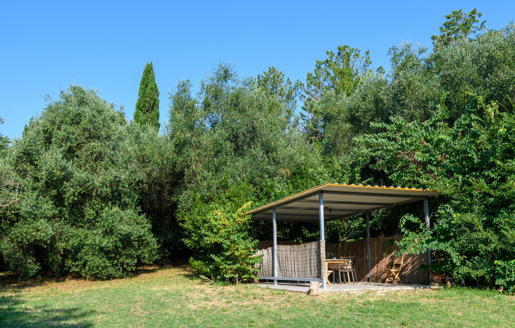 Sur la terrasse couverte, vous pouvez savourer votre petit-déjeuner avec vue sur la verdure pendant que les enfants s'amusent à explorer la nature. Allumez le barbecue et laissez l'atmosphère paisible vous envahir avec du vin et des bougies.