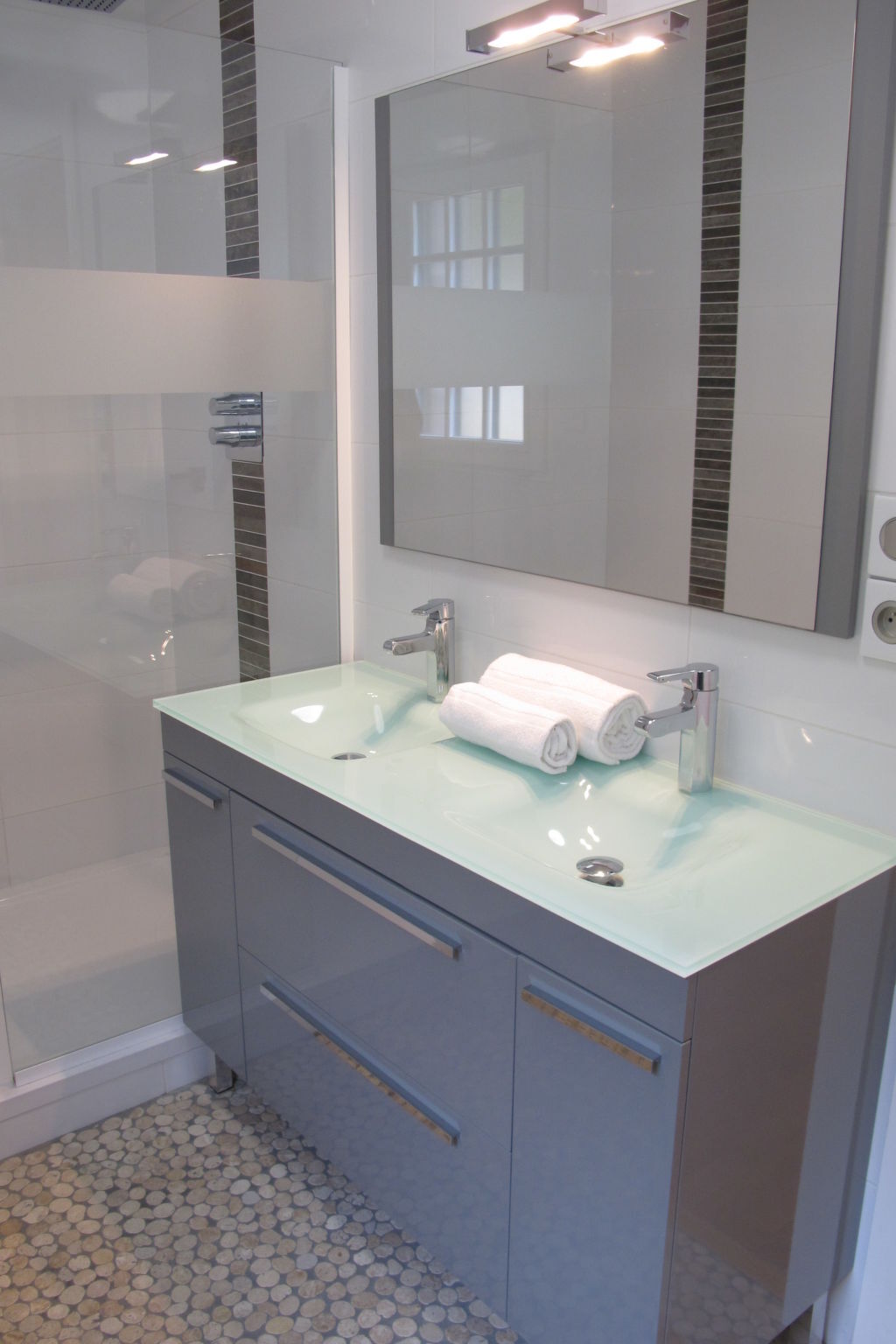 Douche, WC séparé, double vasque.