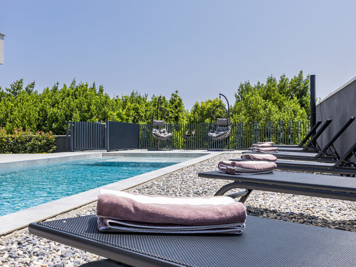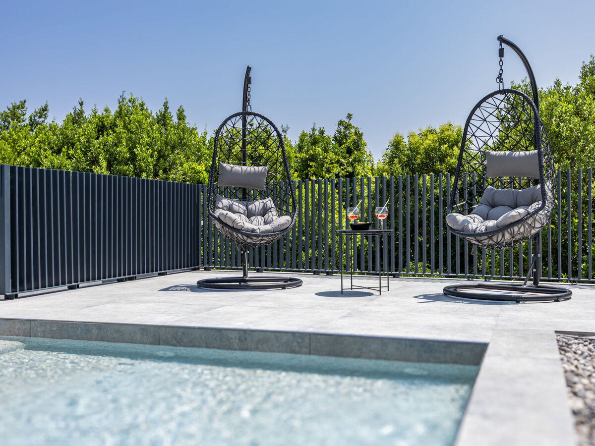 A usage privé: terrain 600 m2 (clôturé), jardin avec plantes, piscine rectangulaire (8 x 4 m, profondeur 140 cm, disponibilité saisonnière: 04.Avr.