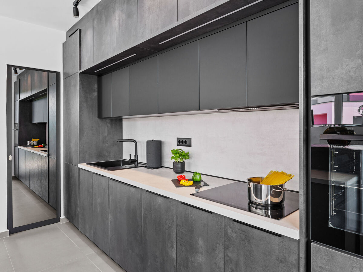Cuisine ouverte (four, lave-vaisselle, 4 plaques vitrocéramiques, micro-ondes, congélateur, cafetière électrique).