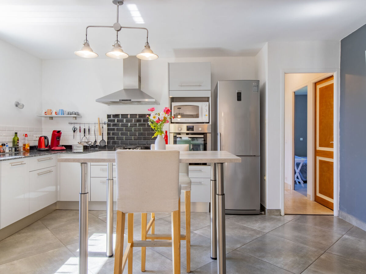 Cuisine ouverte (four, lave-vaisselle, 4 feux, grille-pain, bouilloire électrique, micro-ondes, congélateur, cafetière électrique, Capsules pour machine à café (SENSEO) (NON INCLUSES)).