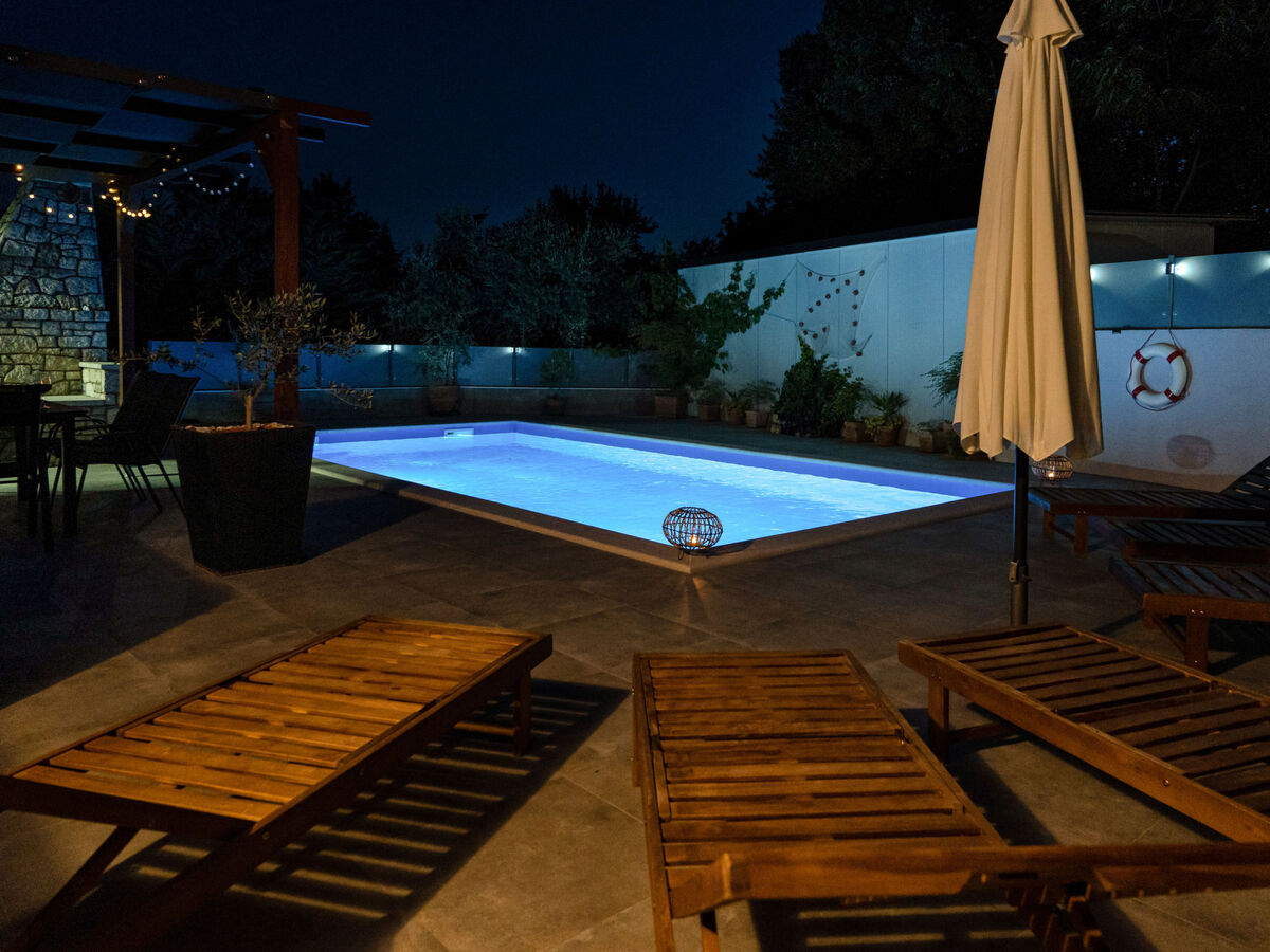 A usage privé: terrain 800 m2 (clôturé), jardin entretenu, piscine rectangulaire (8 x 4 m, profondeur 150 cm, disponibilité saisonnière: 01.Mai.