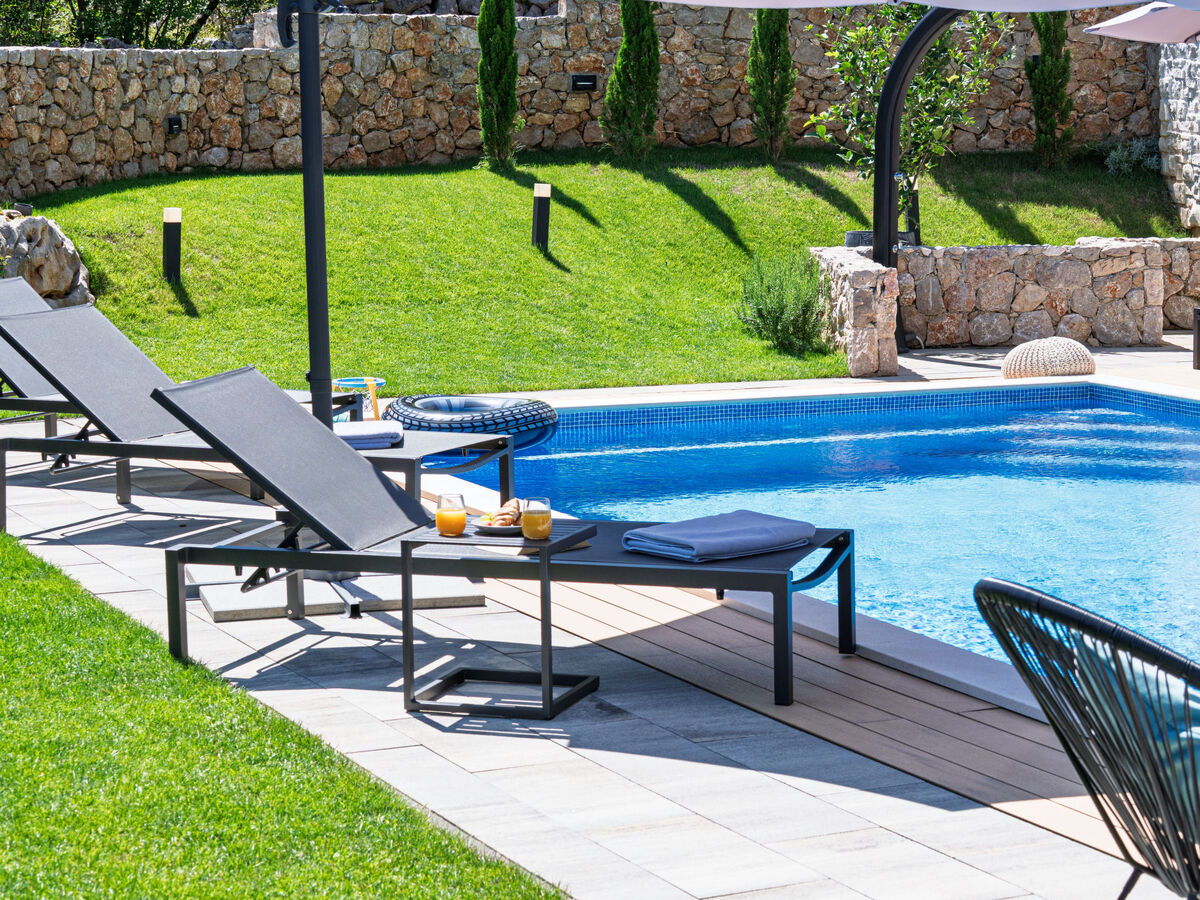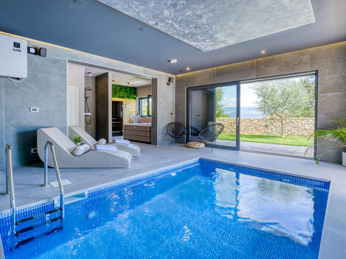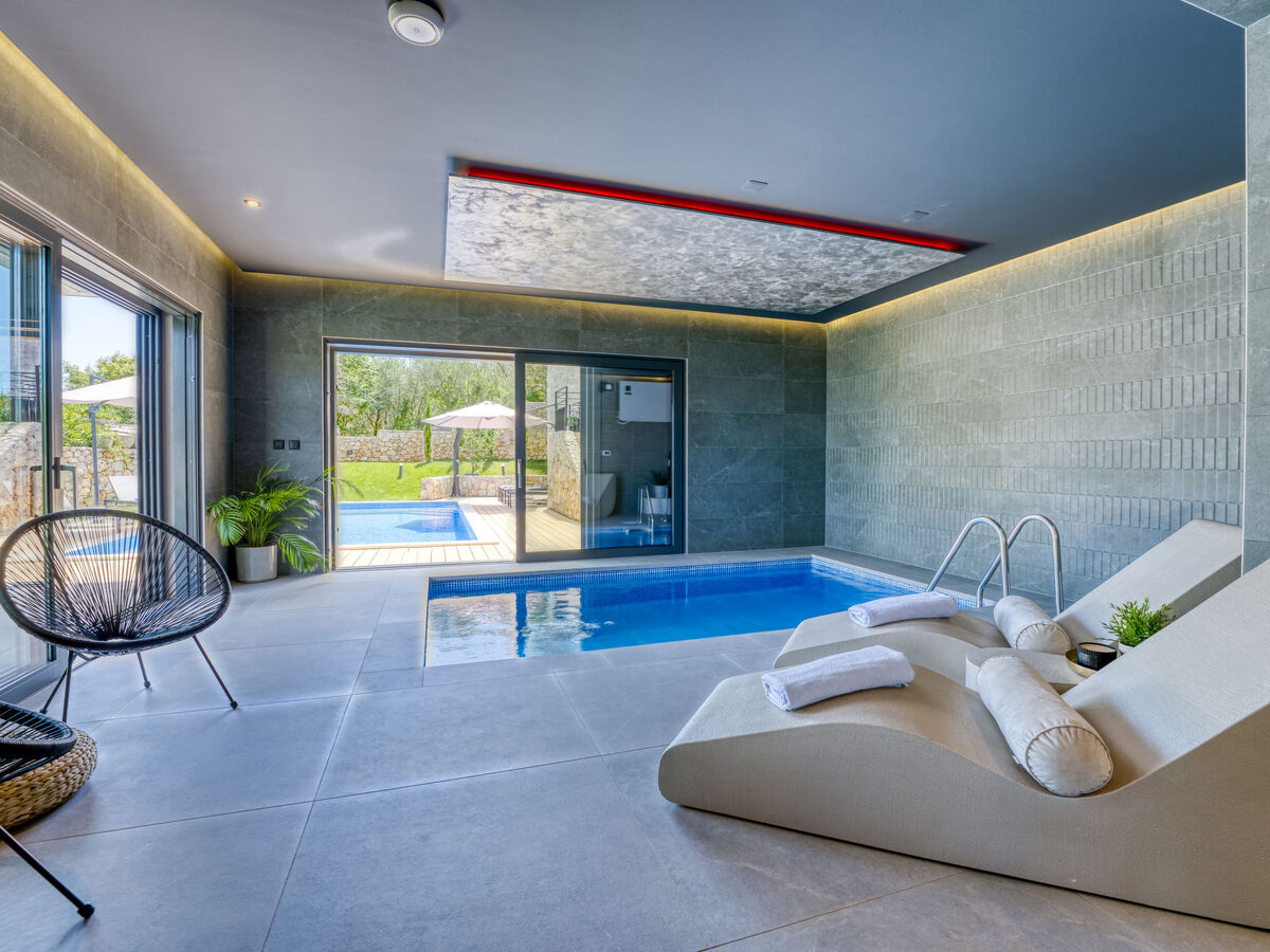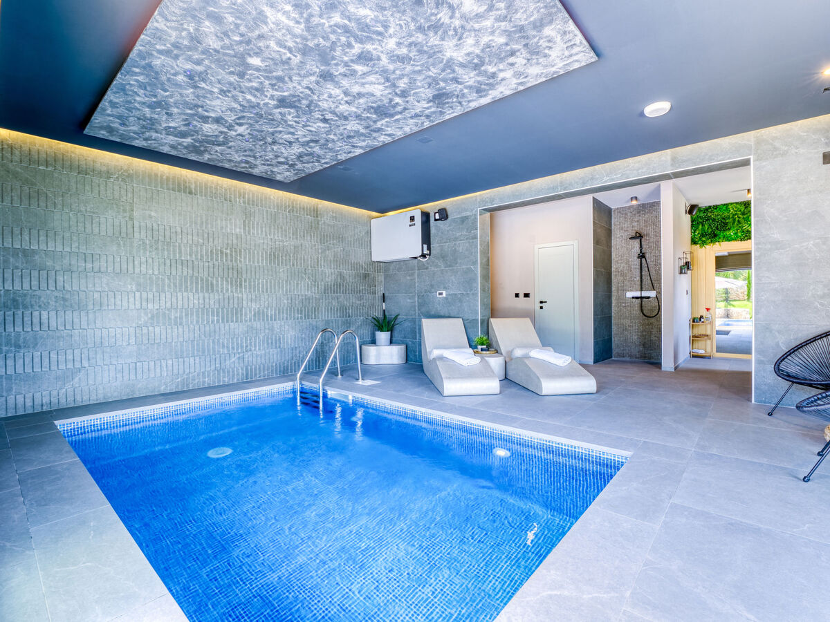 A usage privé: terrain 800 m2 (clôturé), jardin entretenu avec pelouse, piscine, piscine couverte chauffée (8 m2, profondeur 130 cm, disponibilité saisonnière: 01.Jan.