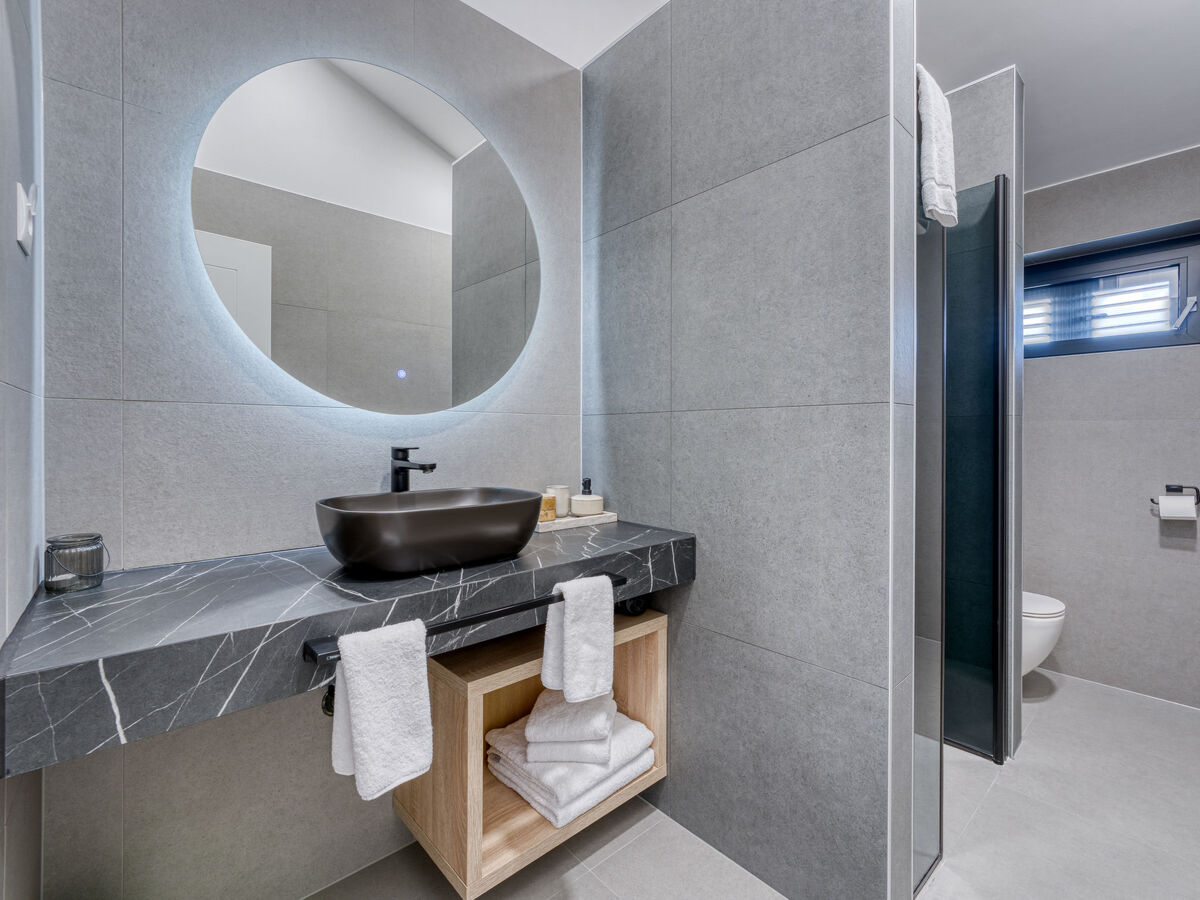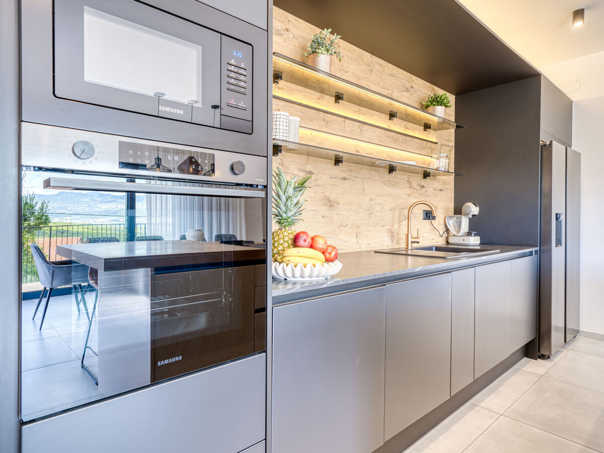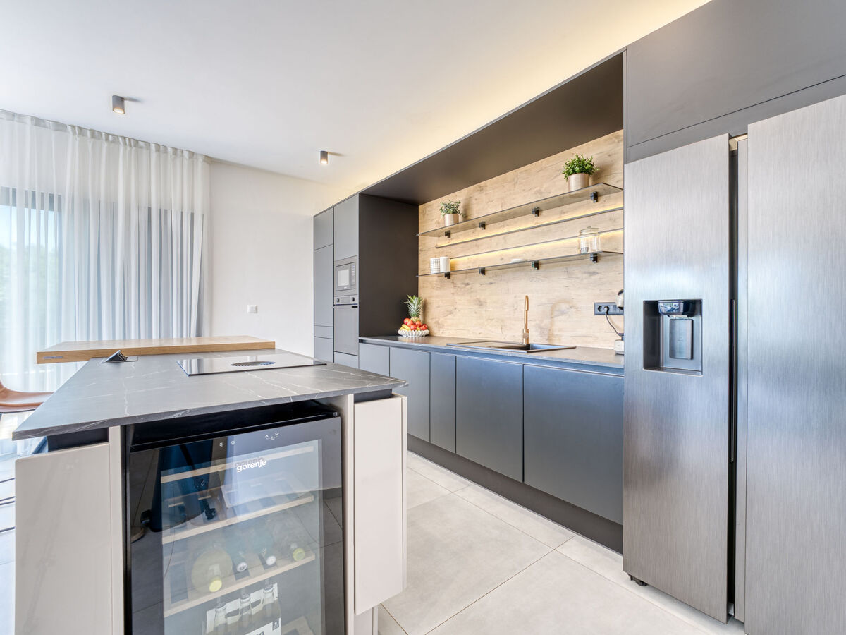 Cuisine ouverte (four, lave-vaisselle, 4 plaques à induction, grille-pain, bouilloire électrique, micro-ondes, congélateur, cafetière électrique).