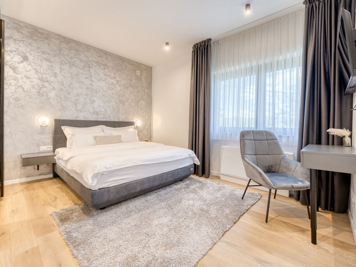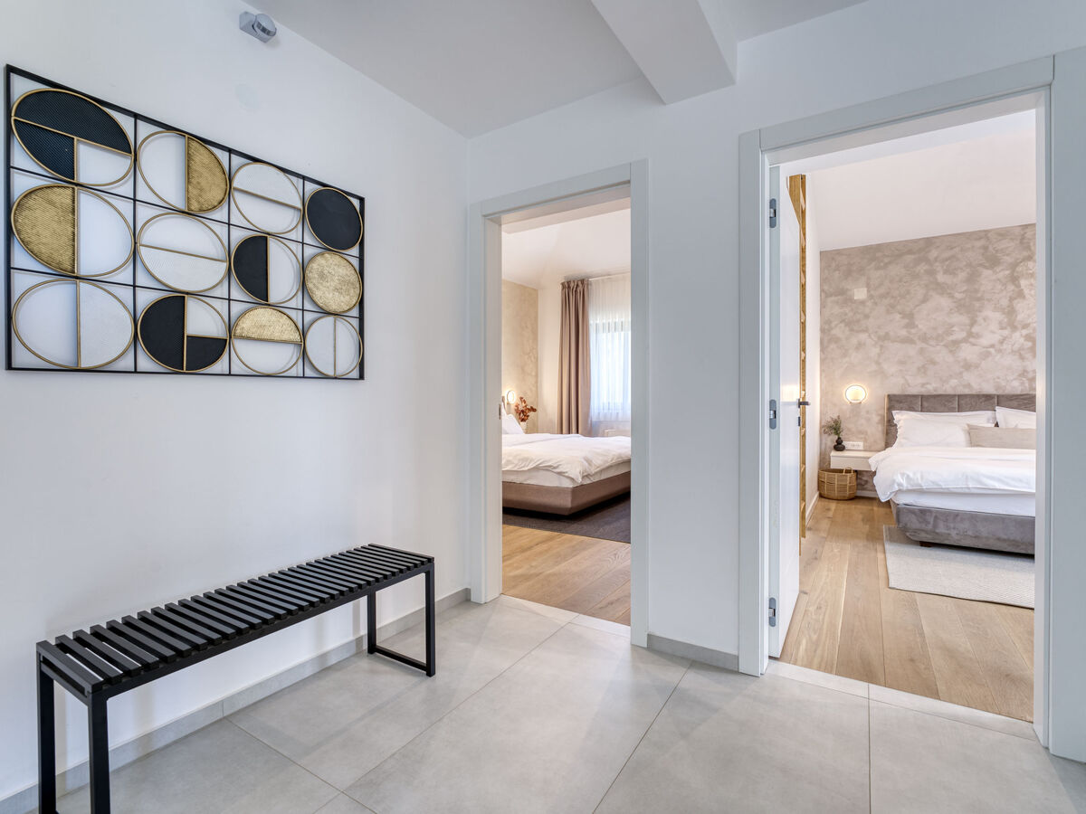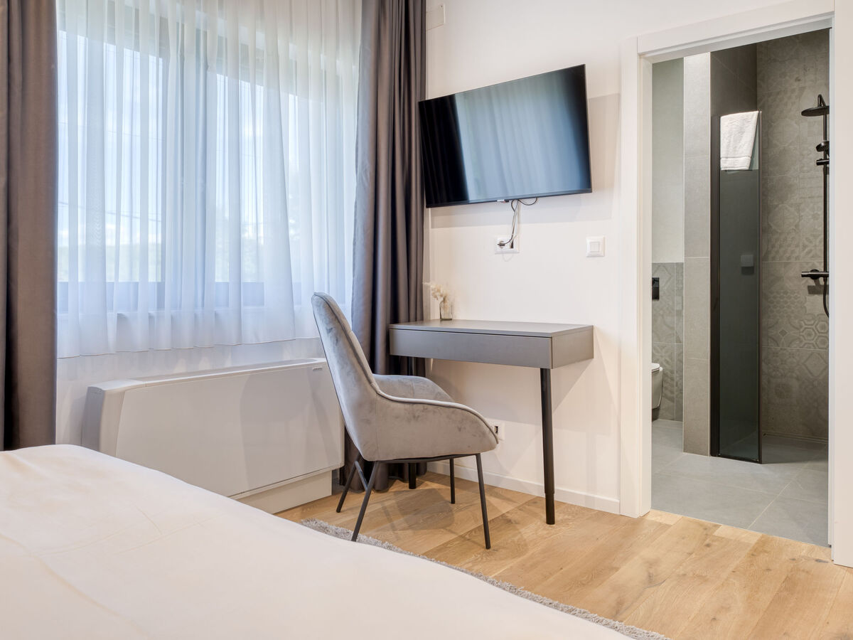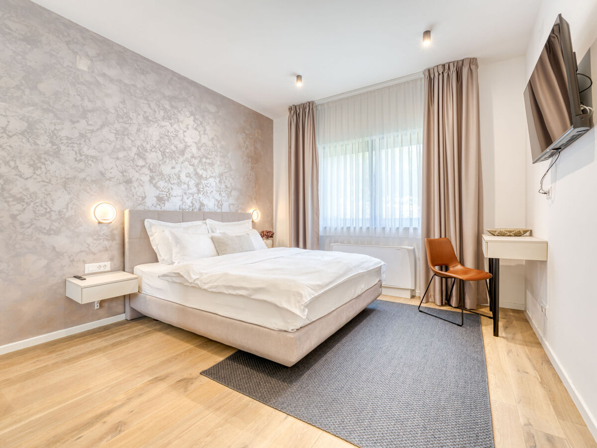 2 chambres, chaque chambre avec: 1 grand-lit (180 cm, longueur 200 cm), douche/WC et TV (satellite).