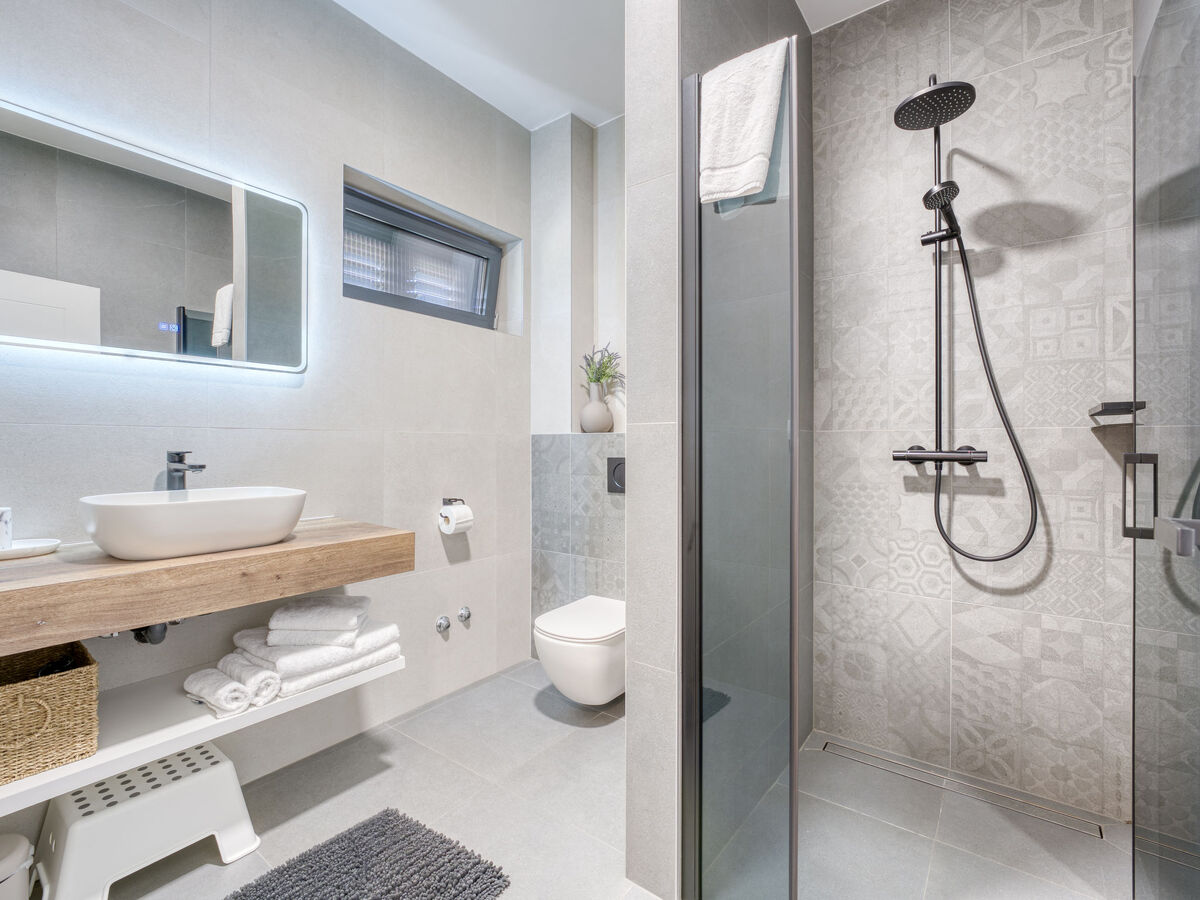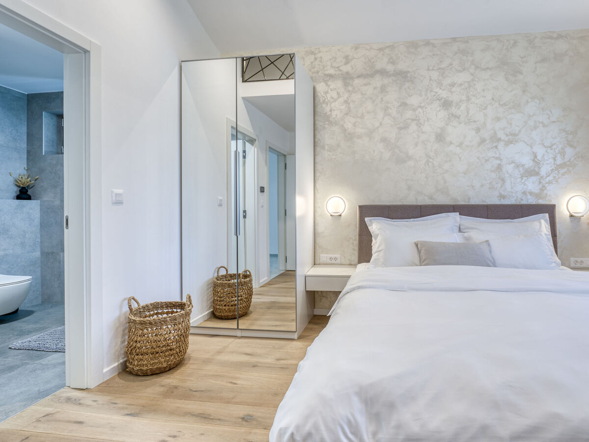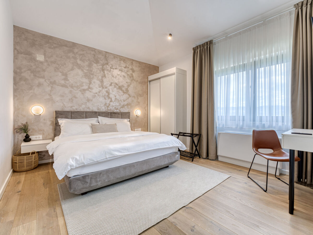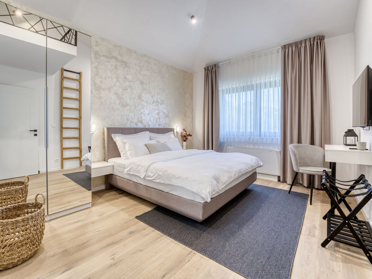 2 chambres, chaque chambre avec: 1 grand-lit (180 cm, longueur 200 cm), douche/WC et TV (satellite).