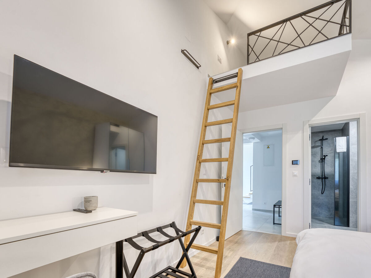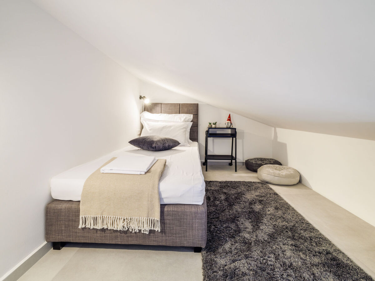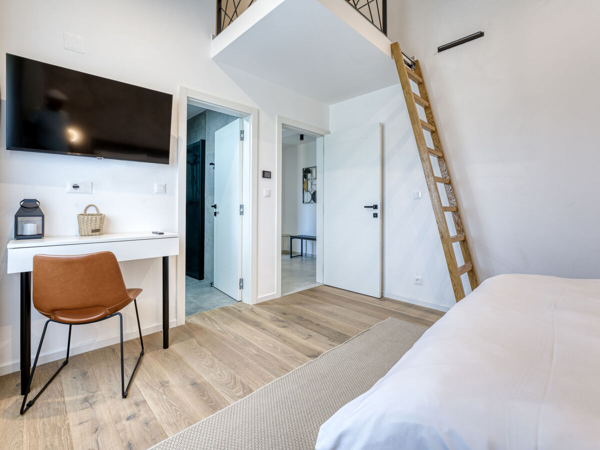 À l'étage supérieur: (escalier sans rampe) 1 chambre avec 1 grand-lit (180 cm, longueur 200 cm), douche/WC et TV (satellite).