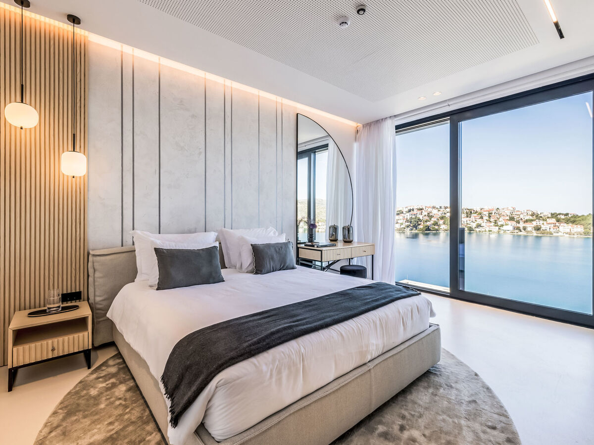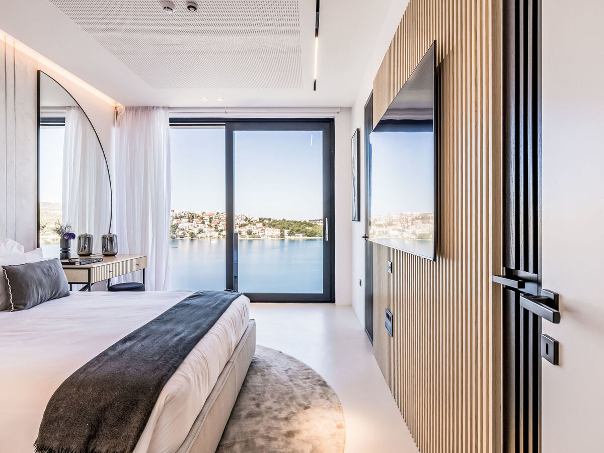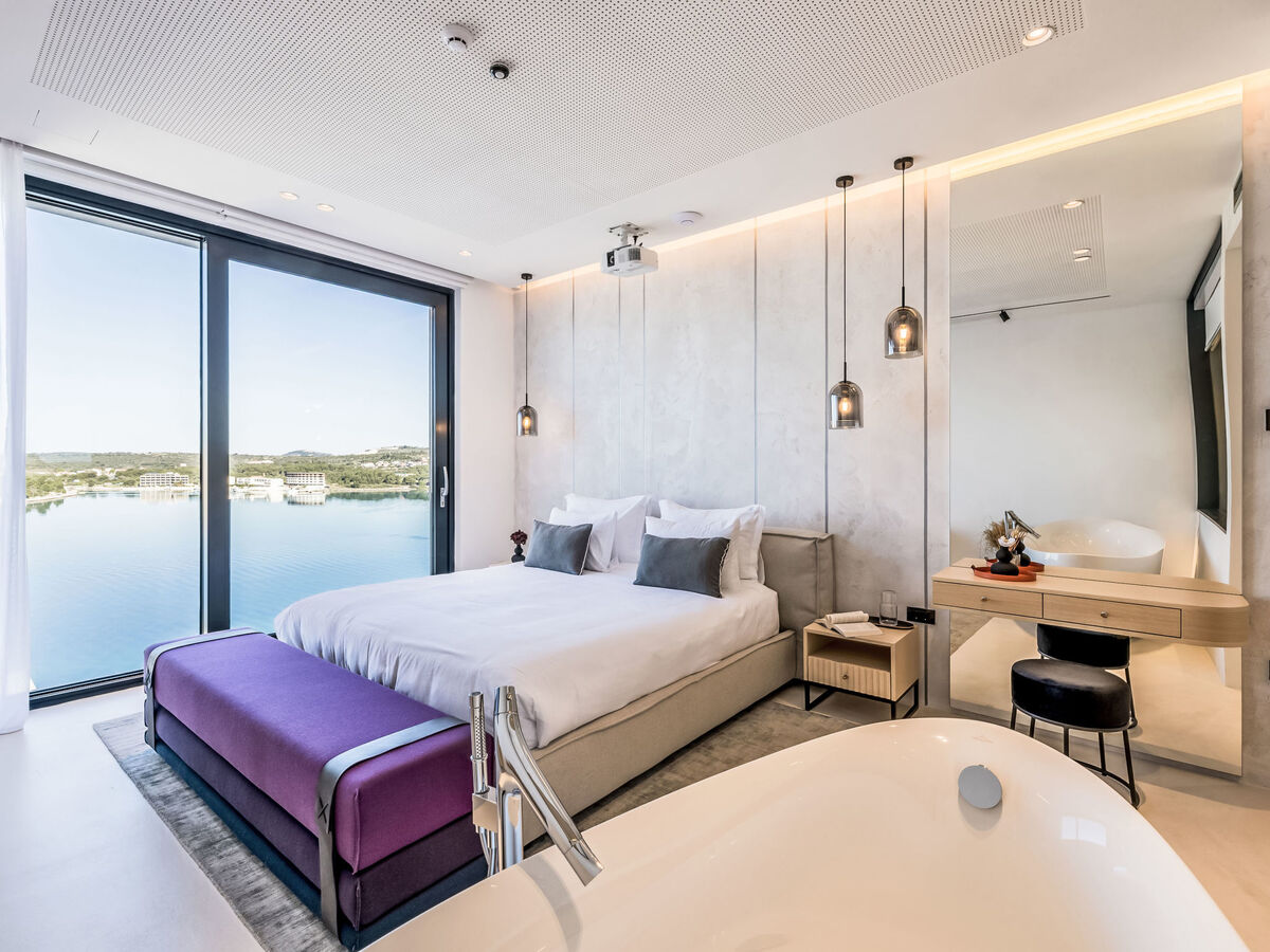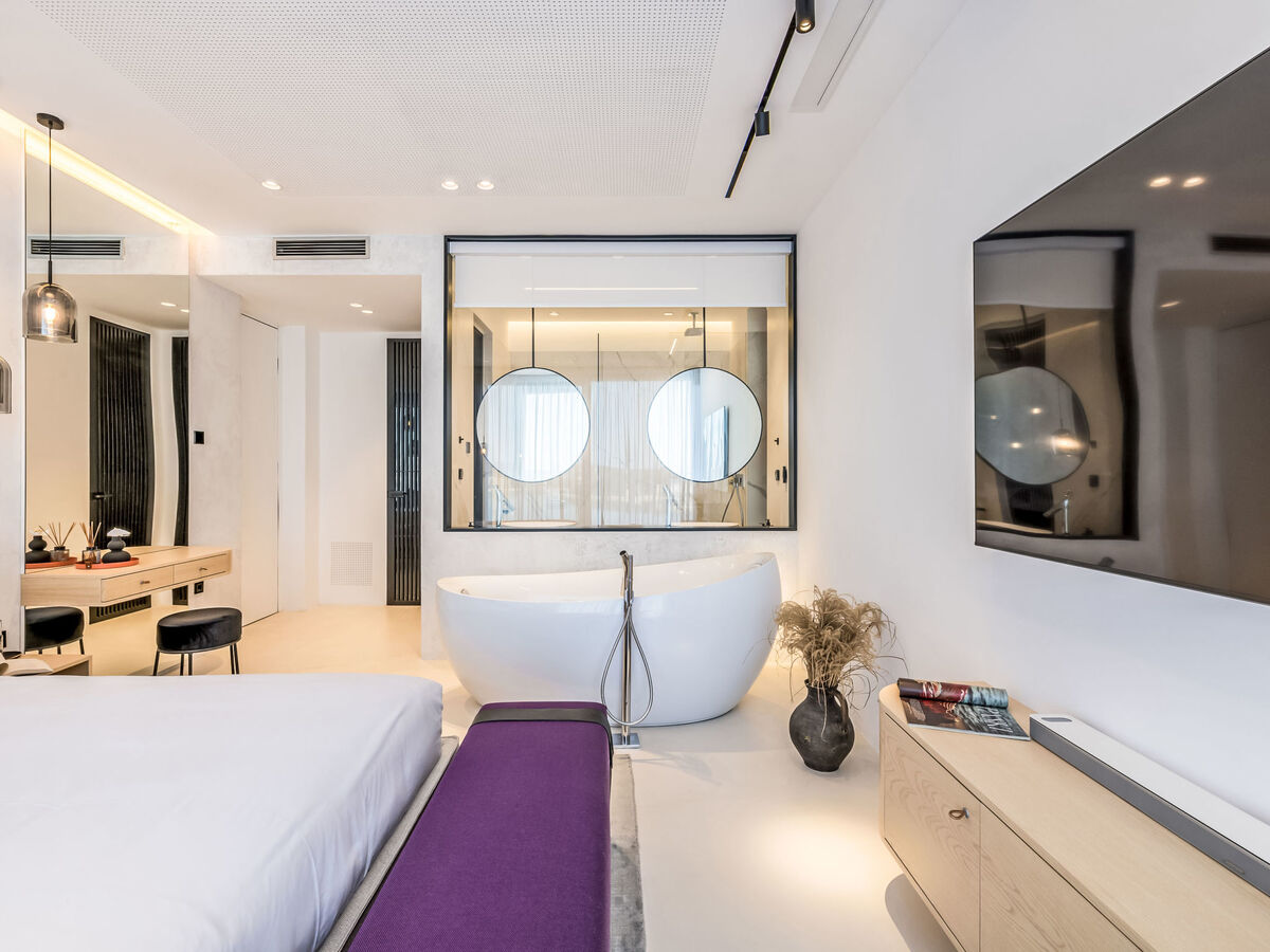 1 chambre avec 1 grand-lit (180 cm, longueur 200 cm), bain/douche/WC, double vasque et TV (satellite) (écran plat), air-conditionné.