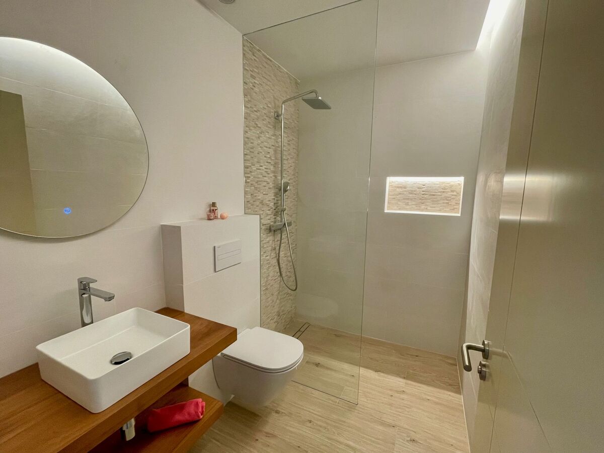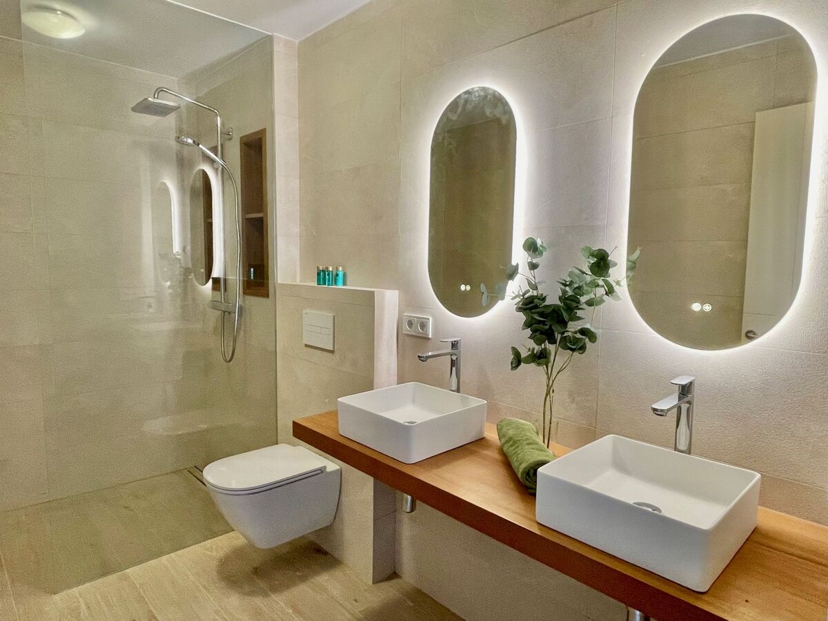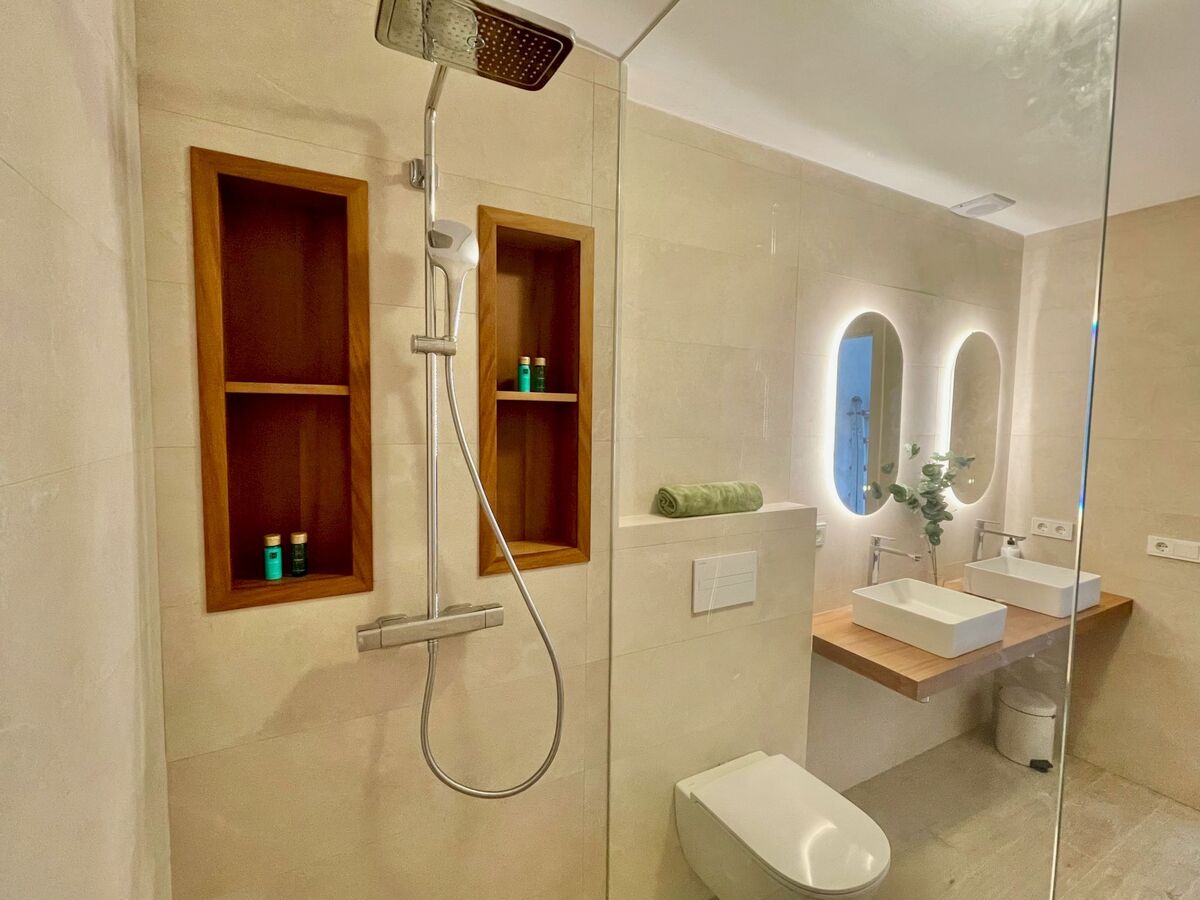 À l'étage inférieur: 2 chambres doubles, chaque chambre avec: 1 grand-lit (180 cm, longueur 210 cm), douche/WC, air-conditionné et ventilateur.