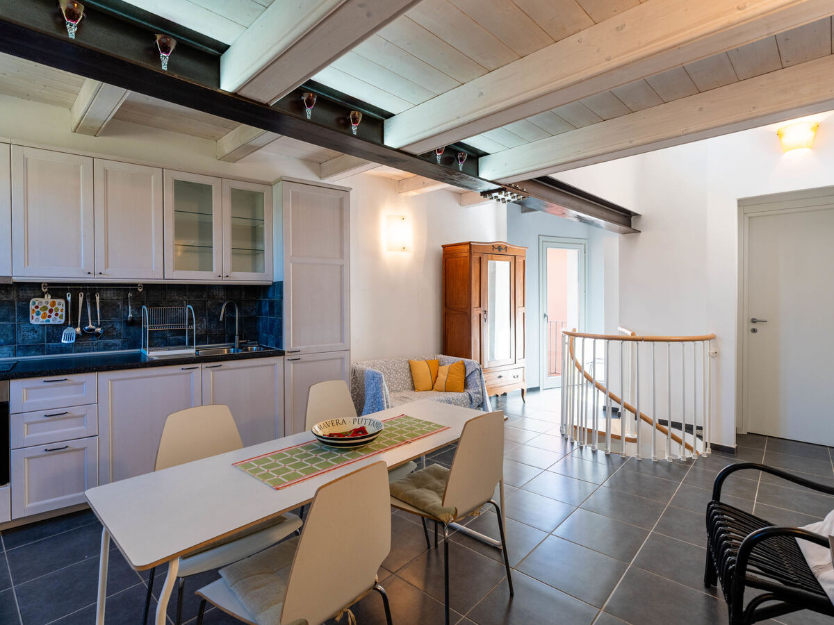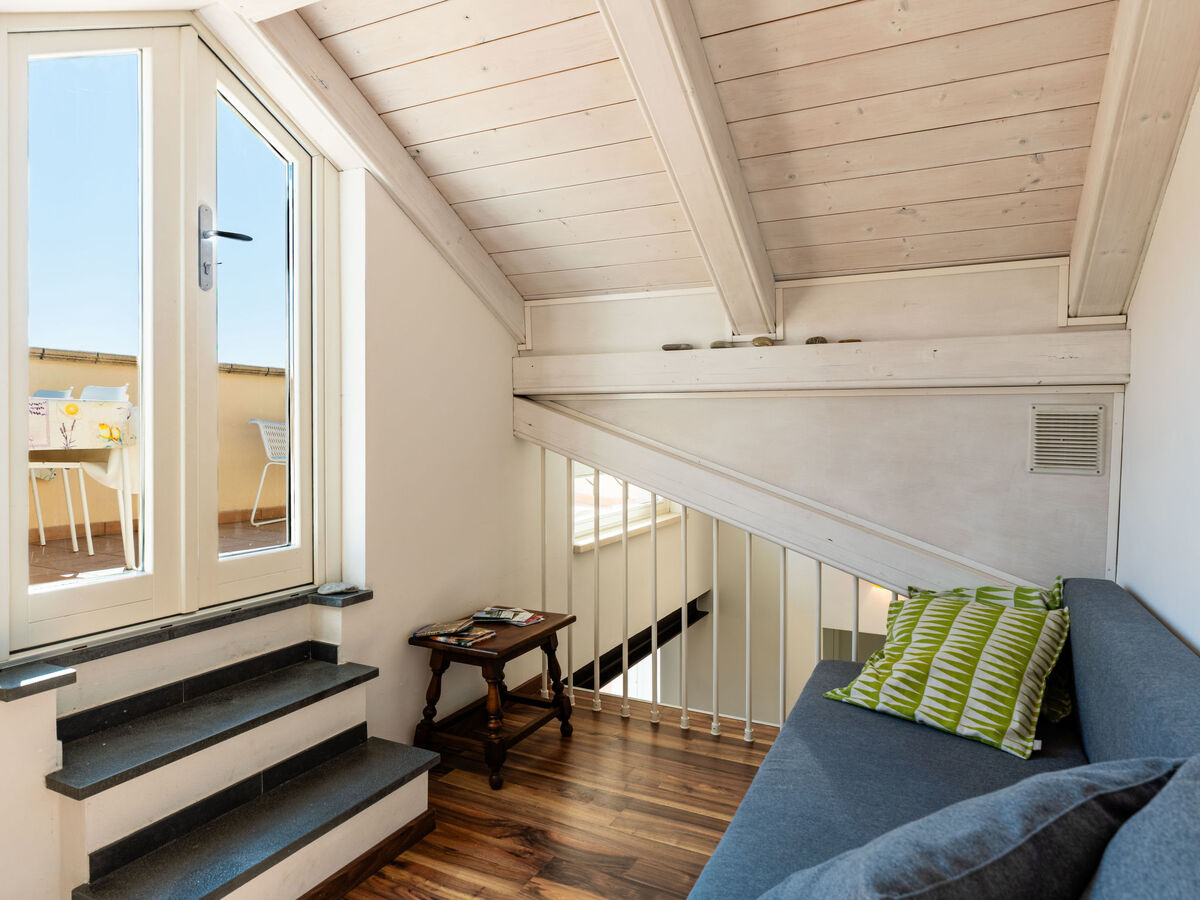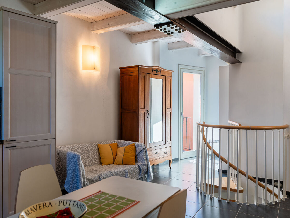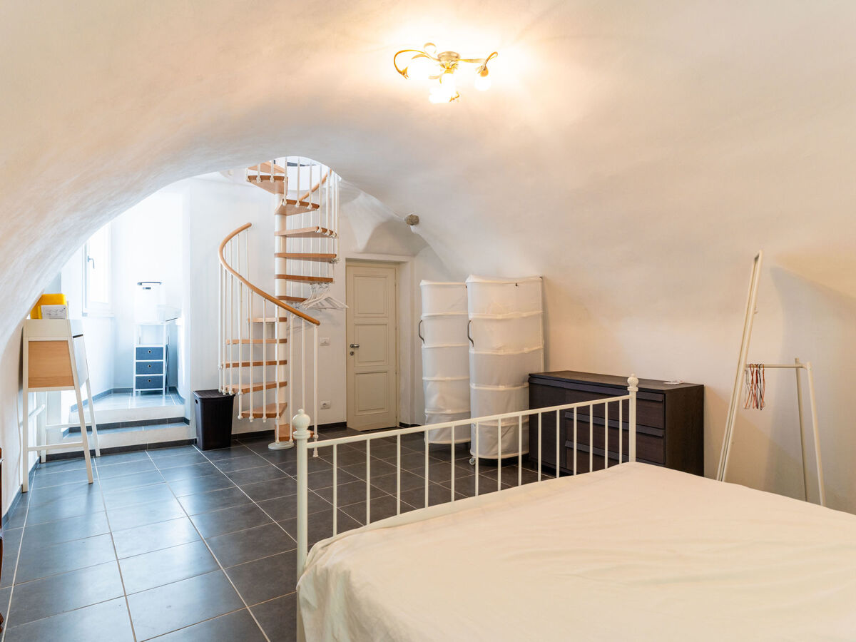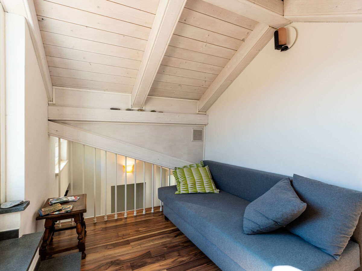 À l'étage supérieur: (escalier en colimaçon) 1 chambre, mansardée, ouverte avec 1 divan-lit (140 cm, longueur 200 cm).
