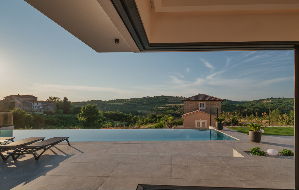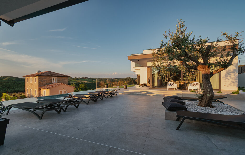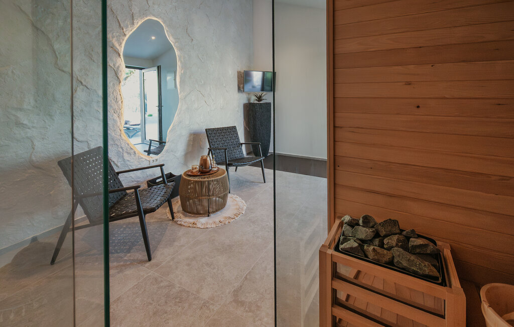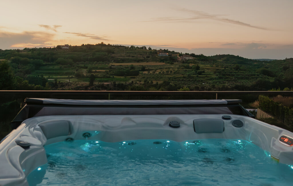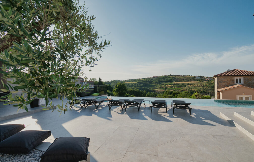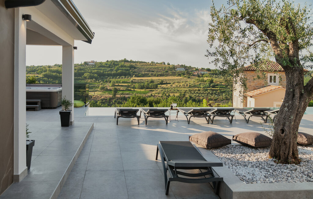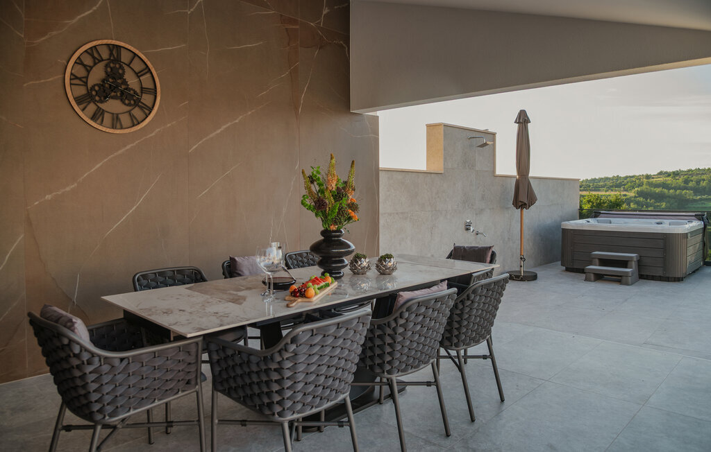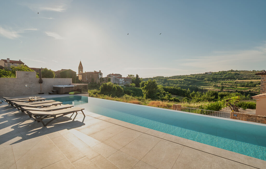 Depuis votre belle terrasse spacieuse, vous bénéficiez d'une vue apaisante sur le paysage pittoresque, que vous pouvez apprécier en prenant un bain de soleil au bord de la magnifique piscine à débordement ou dans le jacuzzi. Le soir, allumez le barbecue et réjouissez-vous de l'ambiance qui règne au bord de la piscine illuminée.