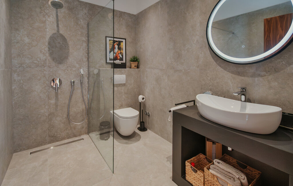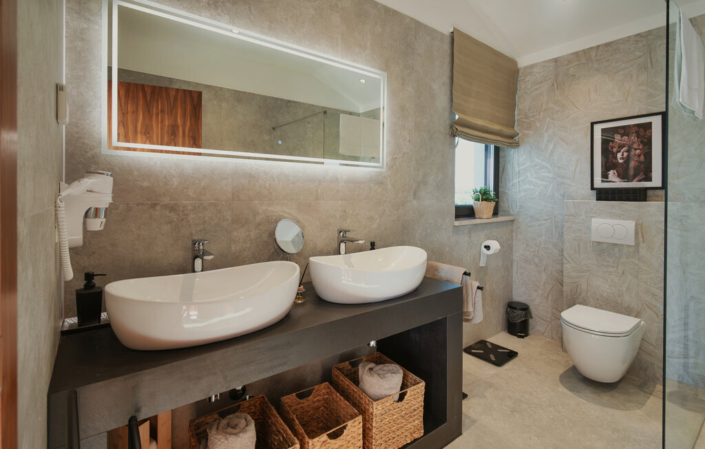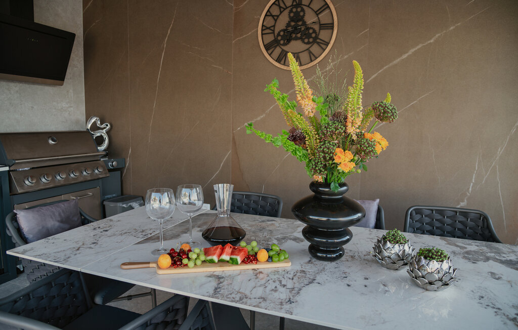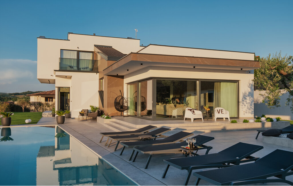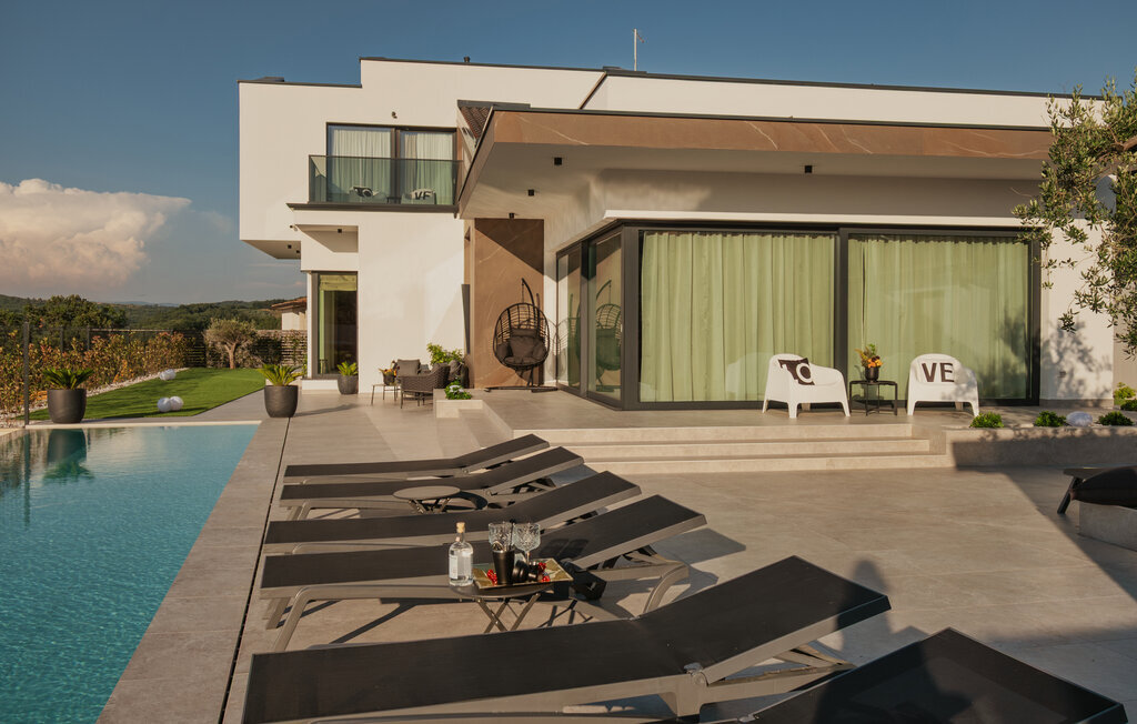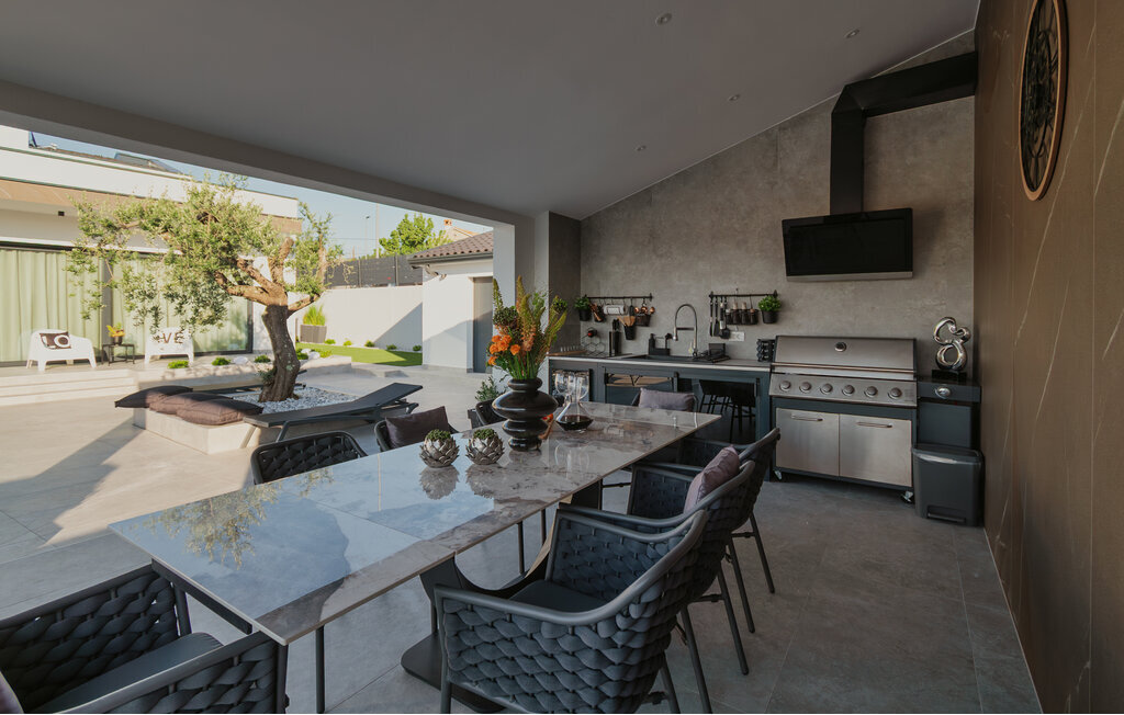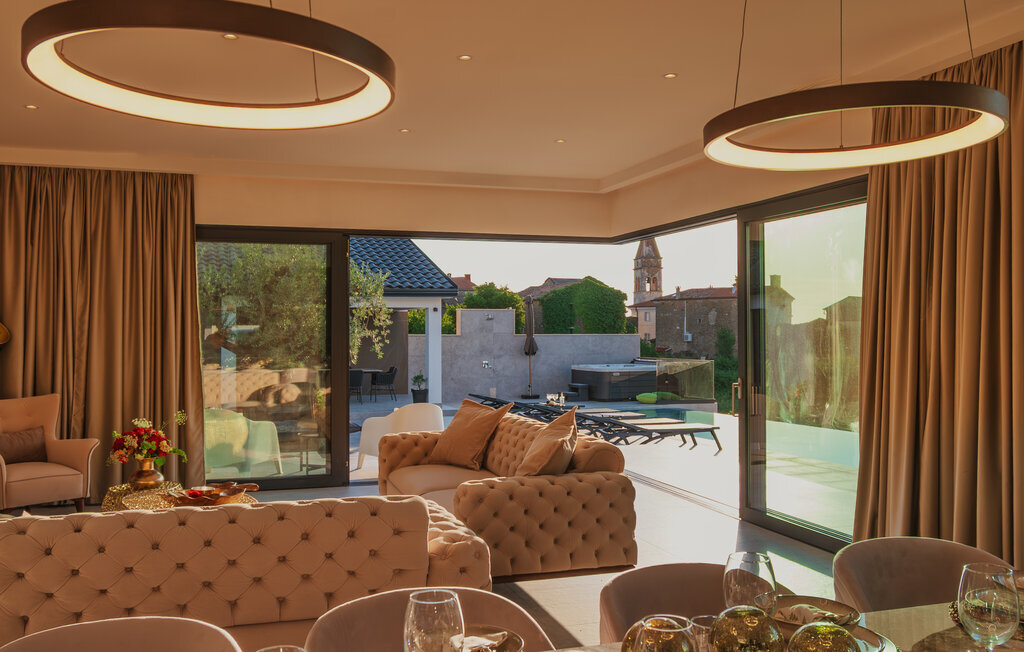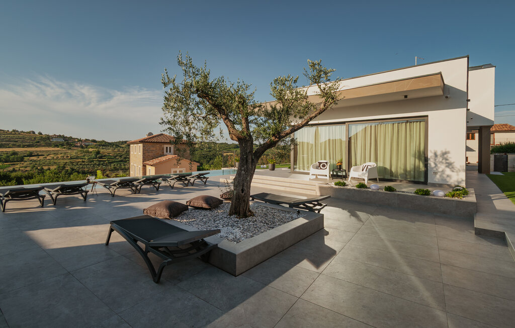 Depuis votre belle terrasse spacieuse, vous bénéficiez d'une vue apaisante sur le paysage pittoresque, que vous pouvez apprécier en prenant un bain de soleil au bord de la magnifique piscine à débordement ou dans le jacuzzi. Le soir, allumez le barbecue et réjouissez-vous de l'ambiance qui règne au bord de la piscine illuminée.