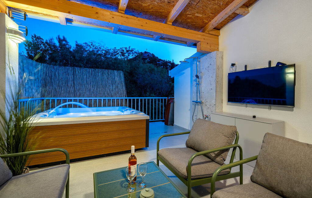 Bien-être à l'extérieur : Location de vacances disposant de chaises-longues et d'un ou plusieurs équipements tels que piscine extérieure, jacuzzi extérieur, lit à baldaquin de jardin etc...