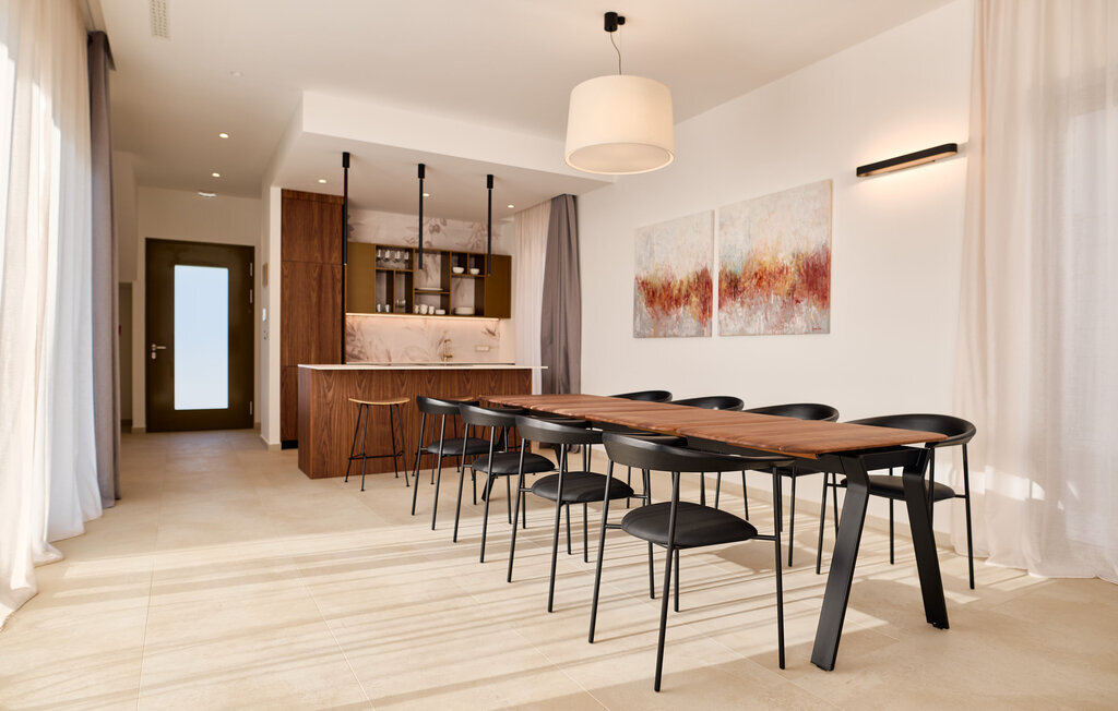 Les espaces intérieurs mettent l'accent sur la chaleur et la fonctionnalité, caractérisées par un design minimaliste et des matériaux de qualité. Détendez-vous dans le salon ouvert avec un canapé confortable, des meubles modernes et de grandes fenêtres panoramiques. Profitez de l'élégante salle à manger pour prendre vos repas en commun ou préparez des délices culinaires dans la belle cuisine.