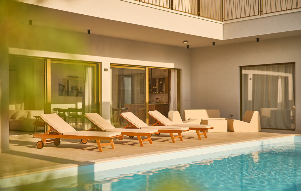 Sortez et profitez du luxe de la piscine privée, accessible directement depuis la terrasse. Allongez-vous sur l'une des chaises longues et détendez-vous au soleil. Profitez de l'espace couvert pour prendre votre première tasse de café le matin ou pour y passer la soirée avec un verre de vin. Au premier étage, une belle vue sur la mer vous attend également.