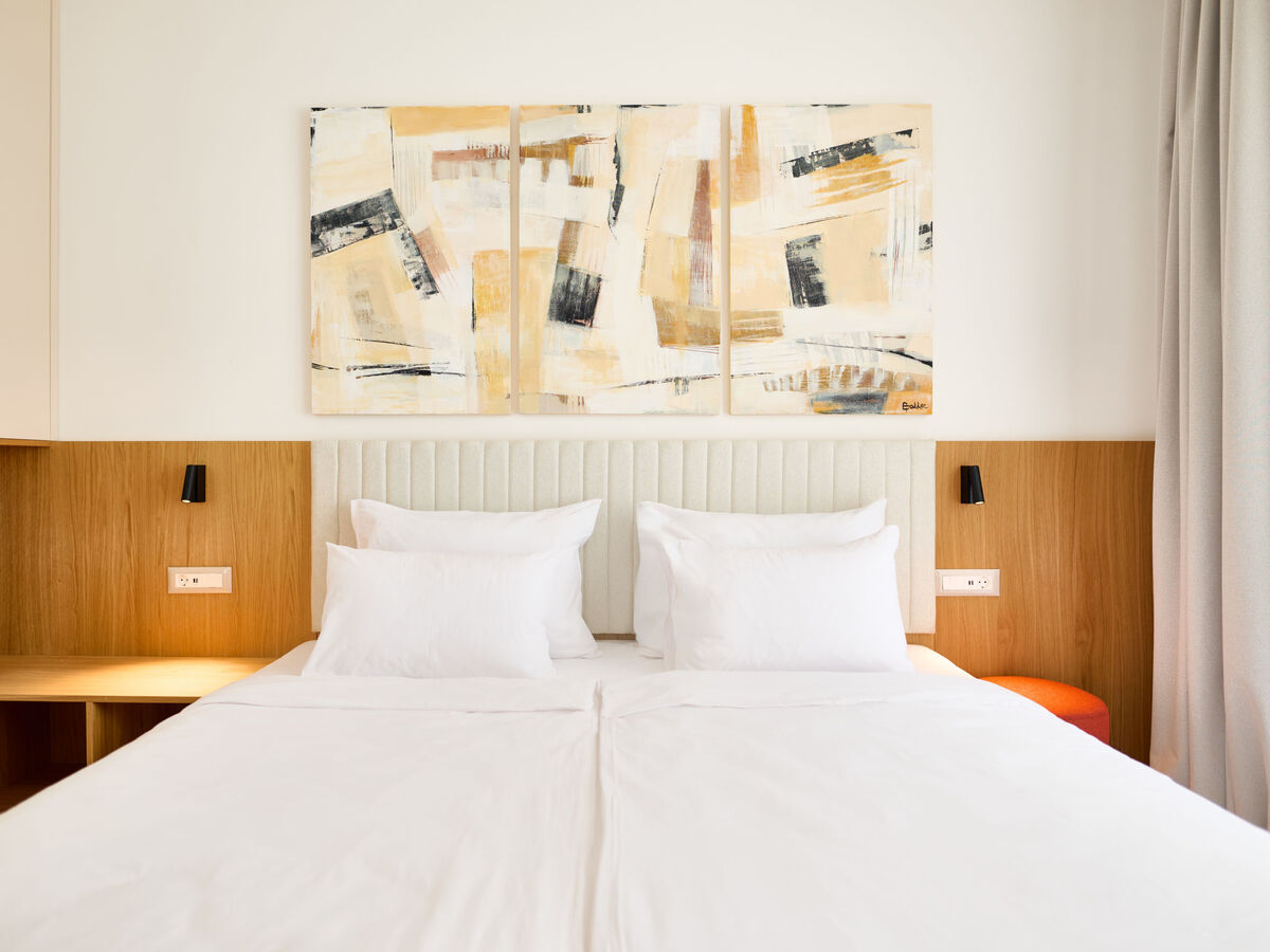 1 chambre avec 1 grand-lit (200 cm, longueur 210 cm), douche/WC.