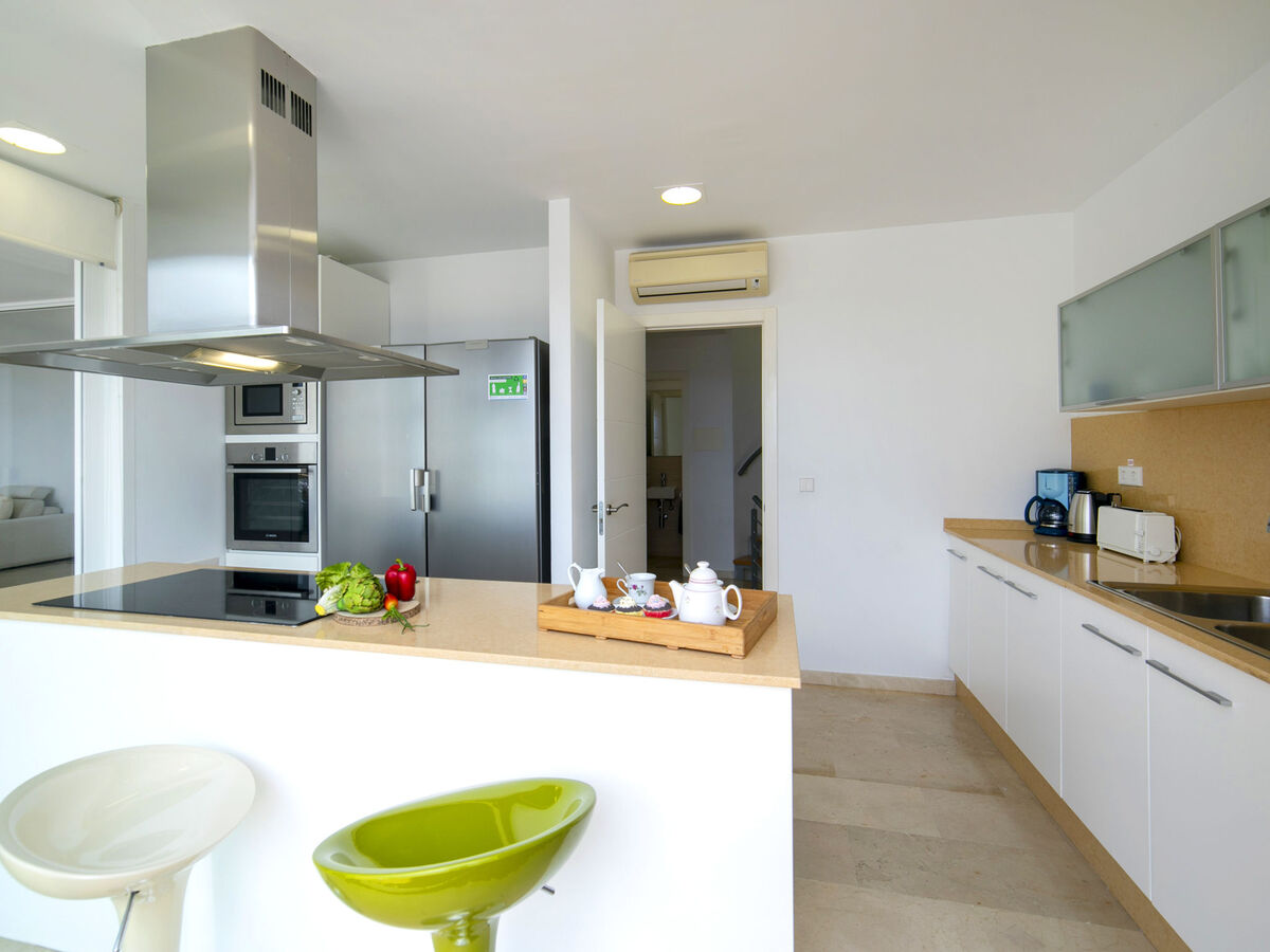 Cuisine ouverte (four, lave-vaisselle, 3 plaques vitrocéramiques, grille-pain, bouilloire électrique, micro-ondes, cafetière électrique).