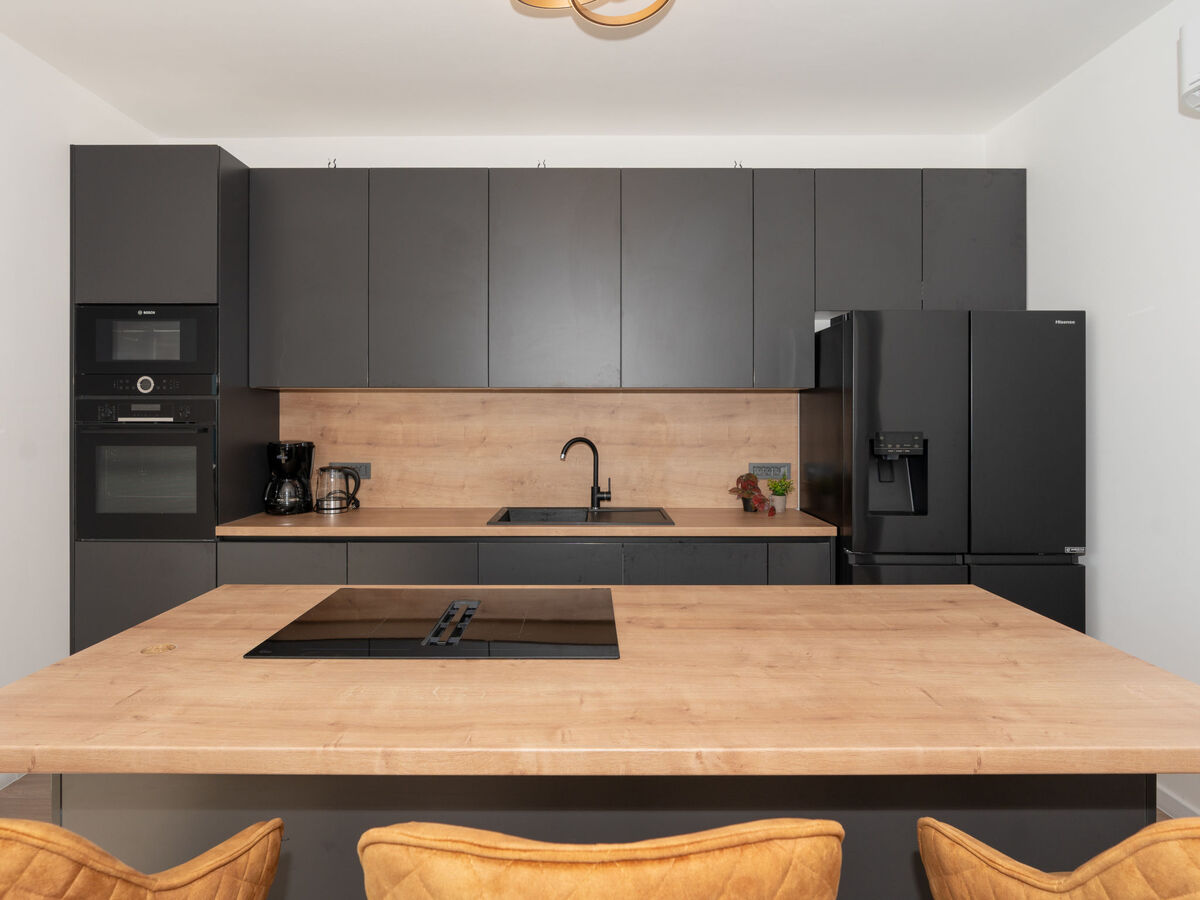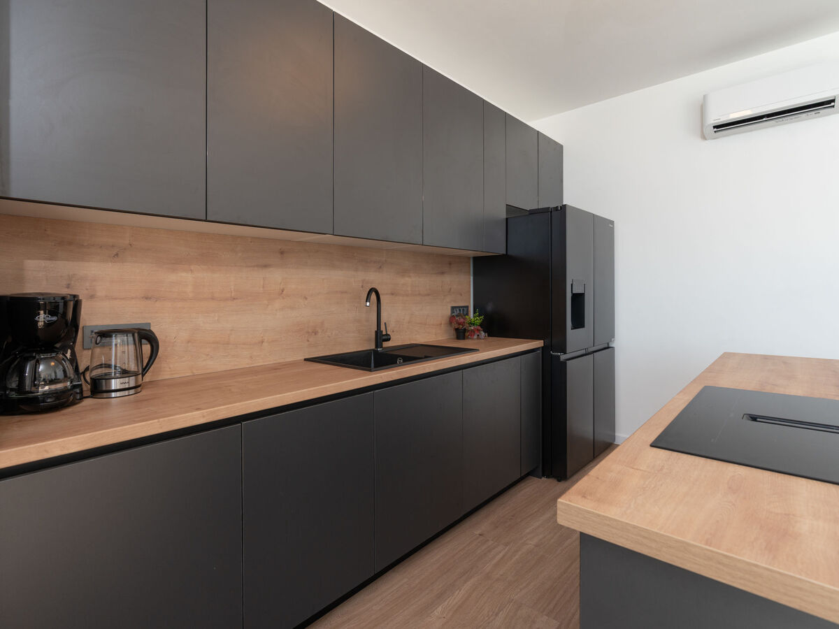 Cuisine ouverte (four, lave-vaisselle, 4 plaques vitrocéramiques, micro-ondes, congélateur, cafetière électrique).