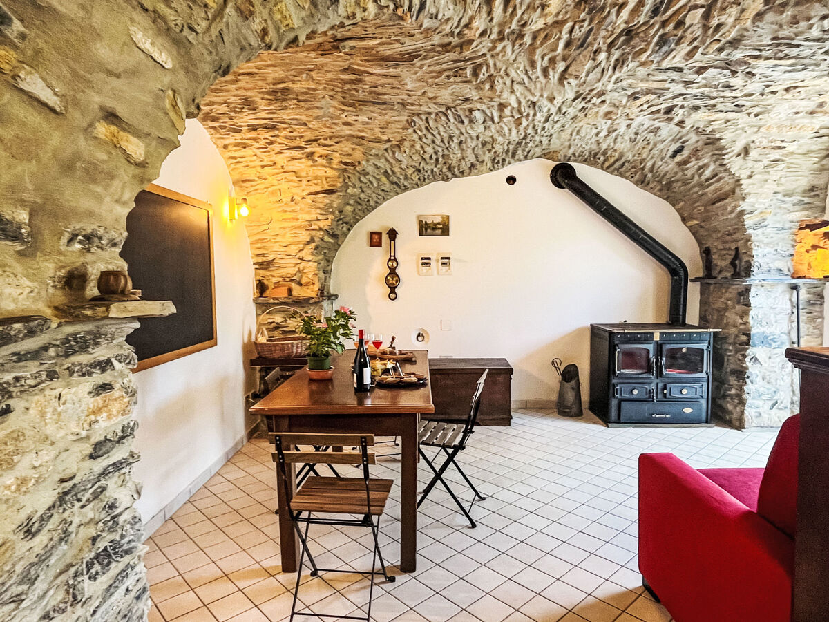 Clair, complètement rénovée, aménagement de bon goût et plaisant: séjour/chambre à coucher avec baie vitrée avec 1 divan-lit double (1 x 140 cm, longueur 200 cm), poêle à bois.