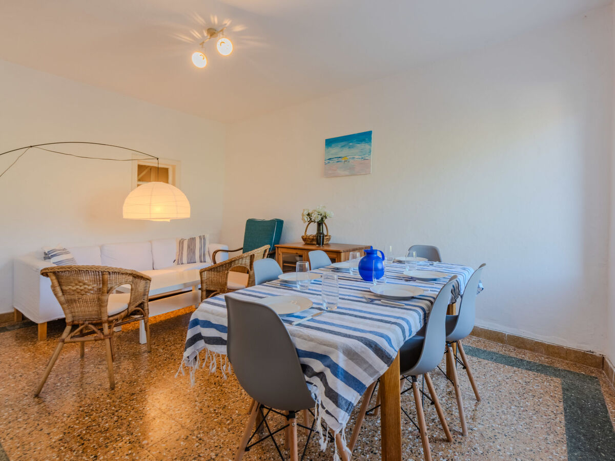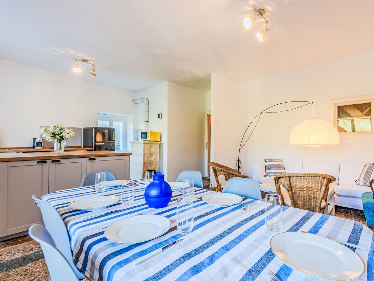 (lave-vaisselle, 4 plaques à induction, grille-pain, bouilloire électrique, micro-ondes, cafetière électrique) avec table pour les repas.