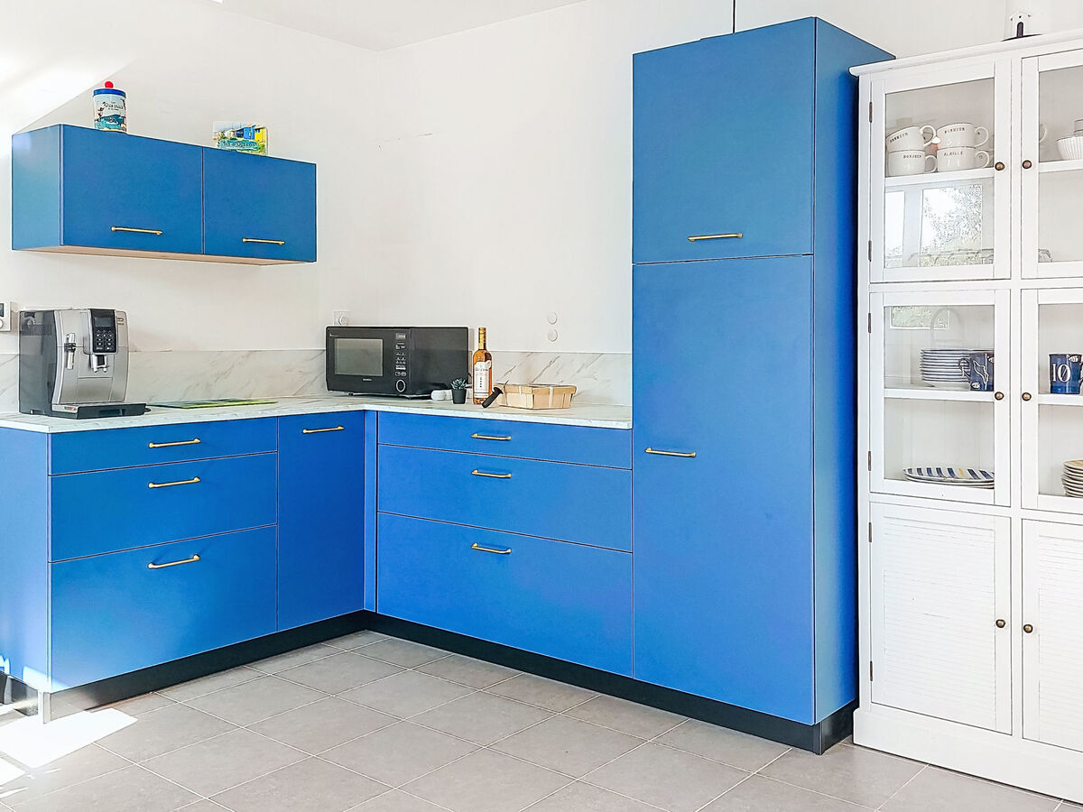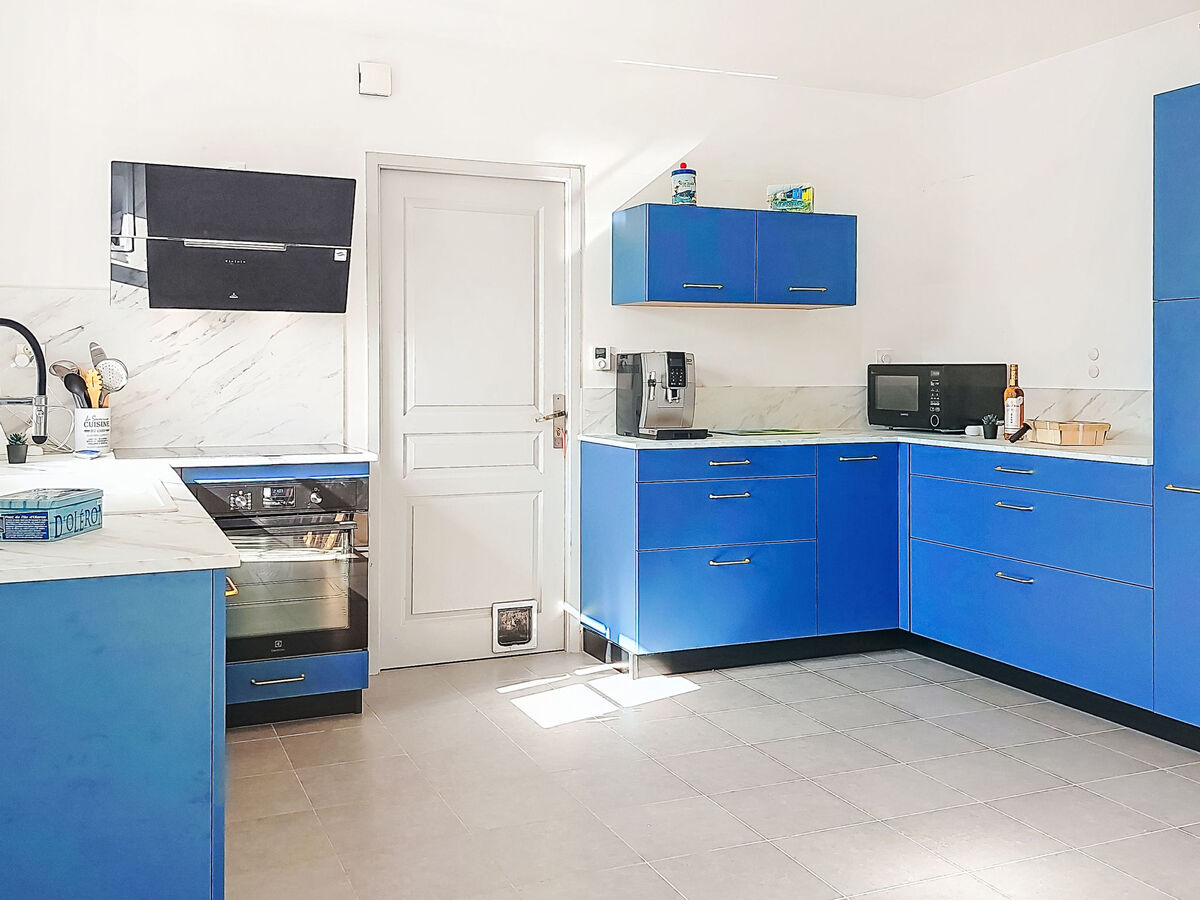 Cuisine ouverte (four, lave-vaisselle, 4 plaques à induction, grille-pain, bouilloire électrique, micro-ondes, congélateur).