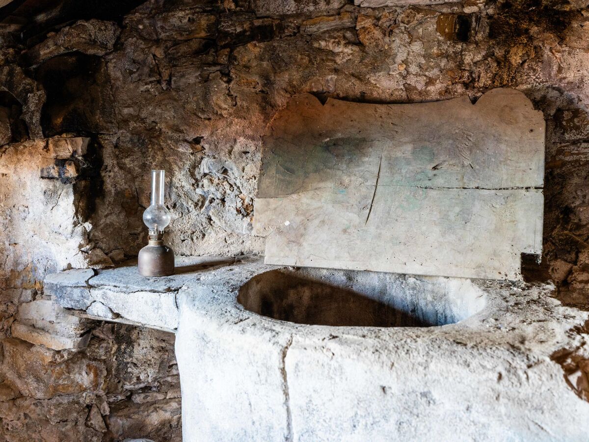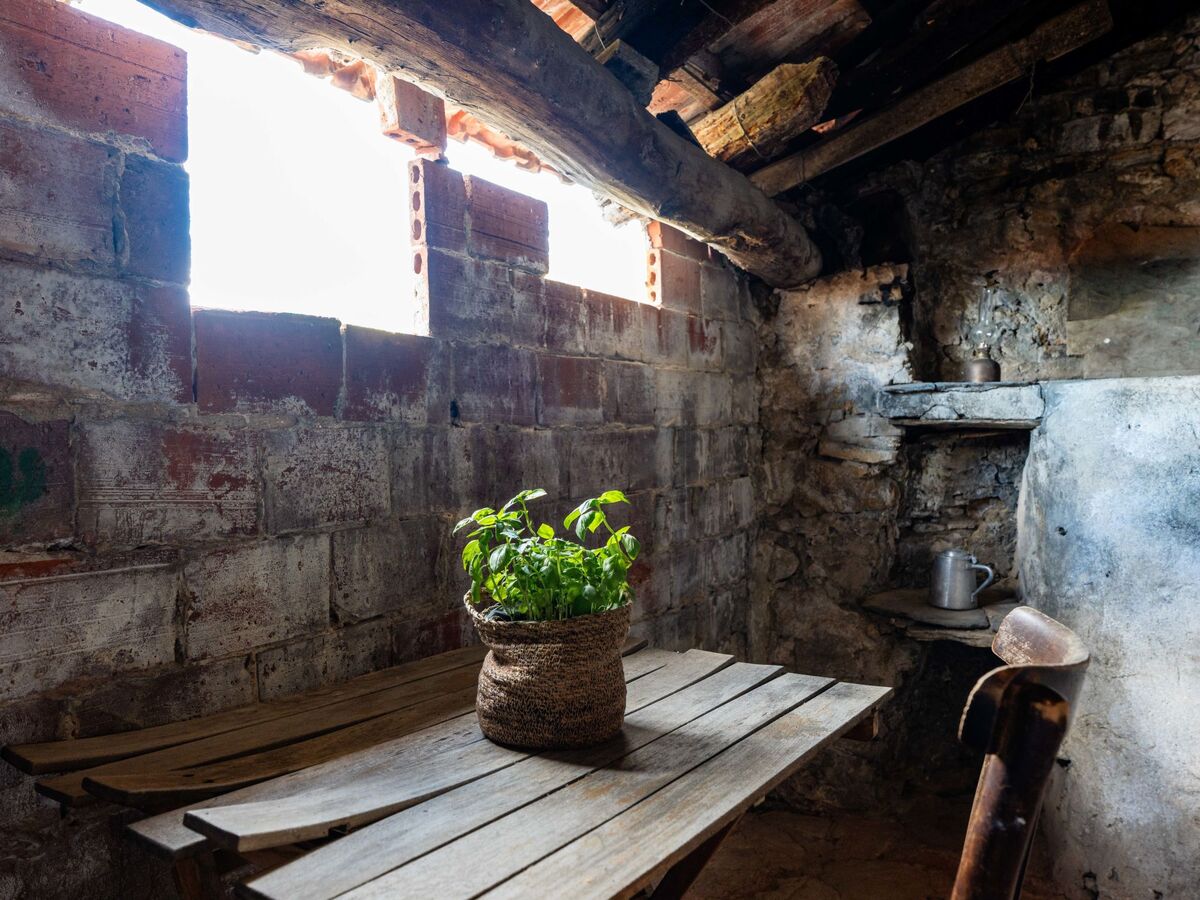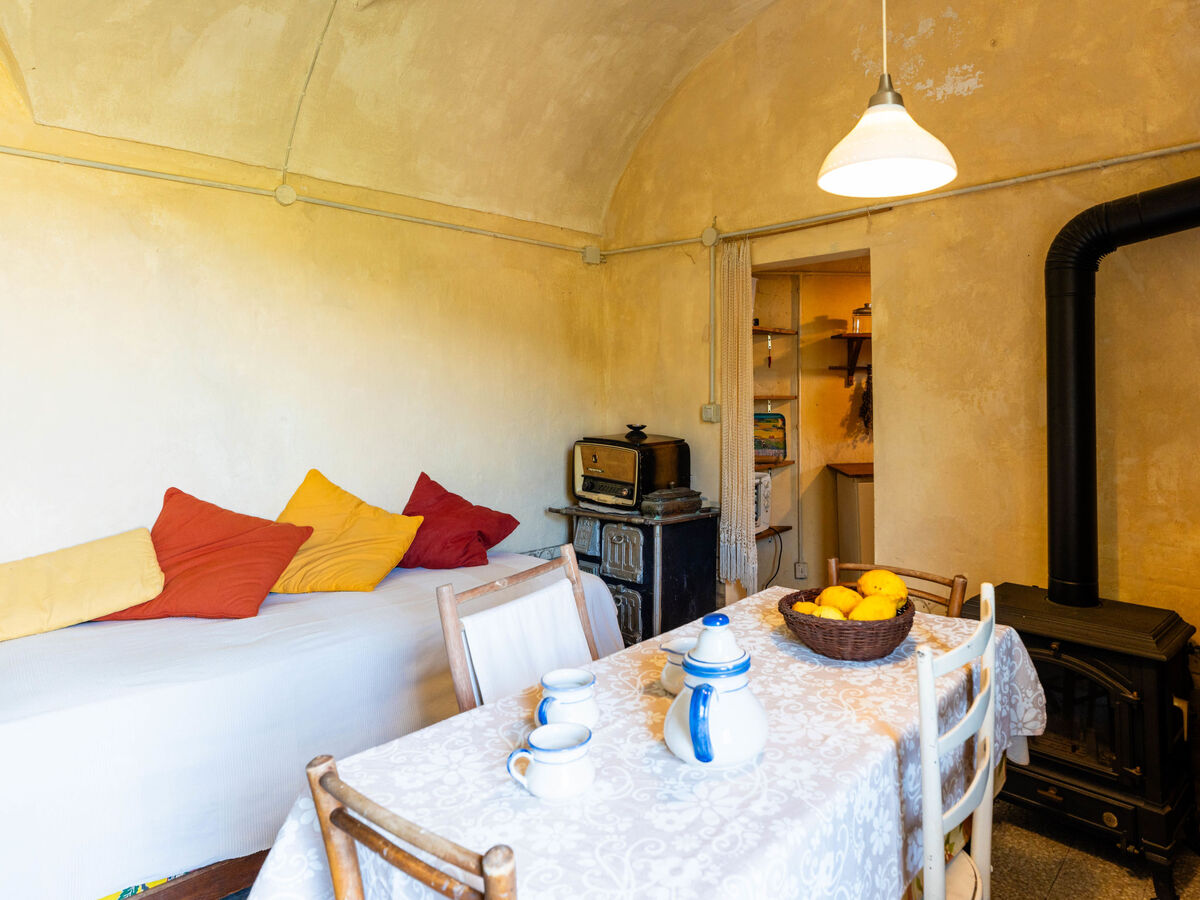 Aménagement fonctionnel et rustique: séjour/salle à manger ouvert avec 1 divan-lit (80 cm, longueur 190 cm).