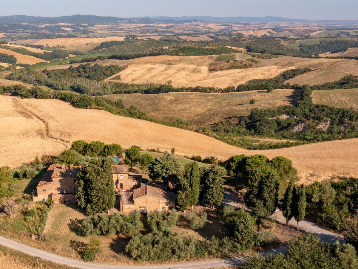 À 7.5 km du centre de Buonconvento, à 16 km du centre de Montalcino, situation ensoleillée sur une colline, dans la verdure.
