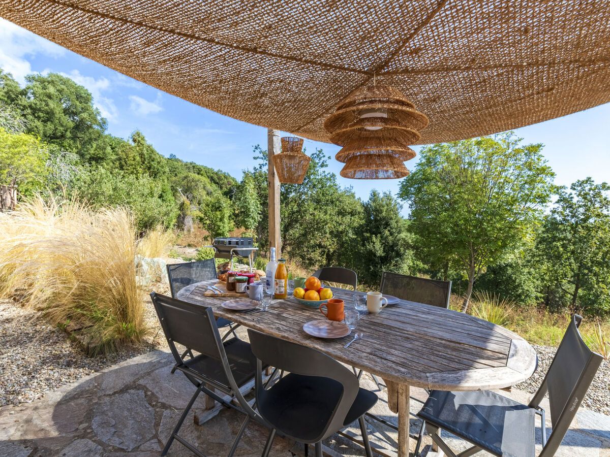 Meubles de terrasse, barbecue, chaises longues (4), place pour s'asseoir.