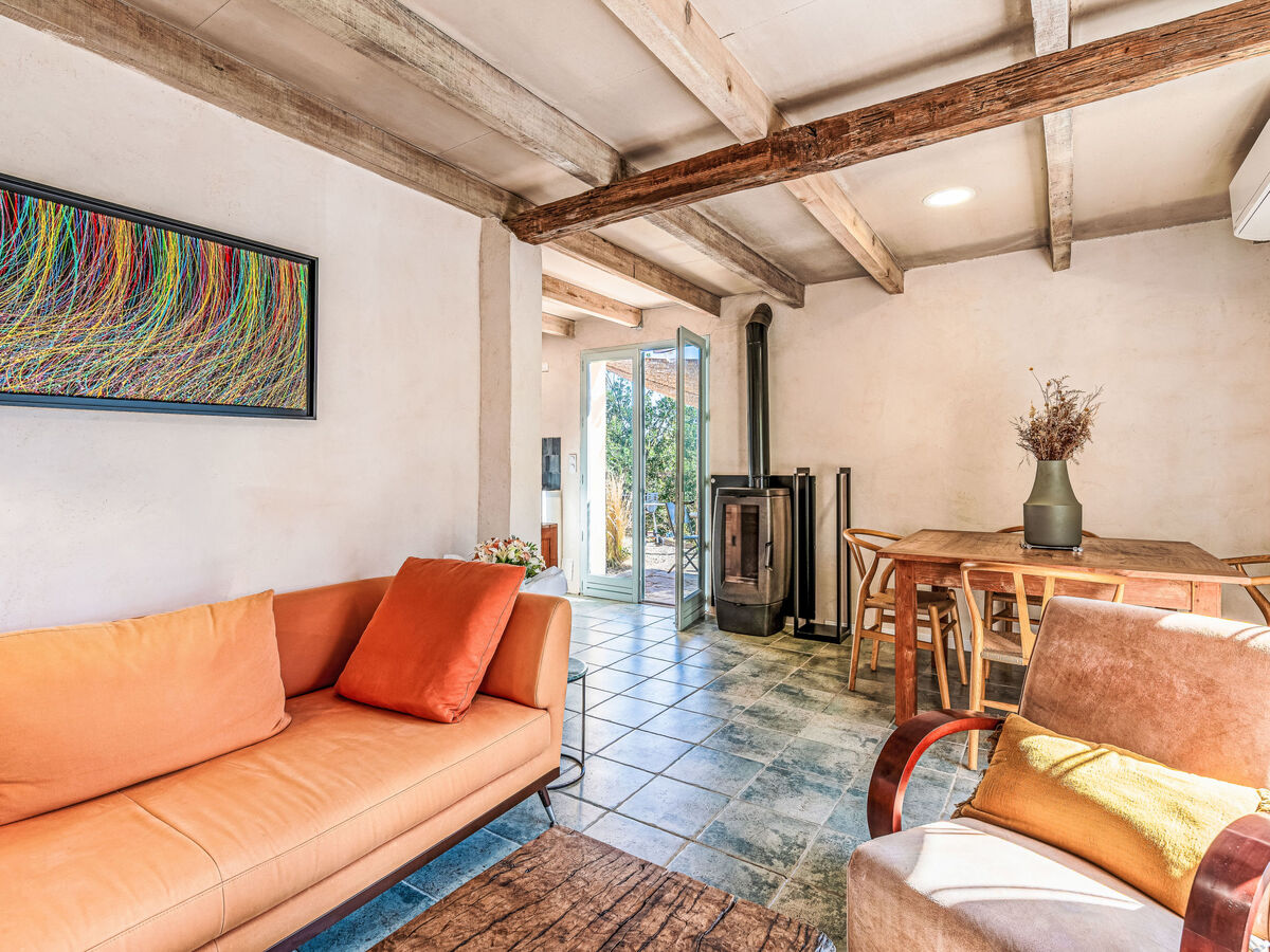 Aménagement confortable et plaisant: séjour/salle à manger avec cheminée, table pour les repas et TV (écran plat), air-conditionné.