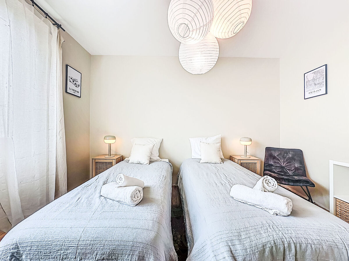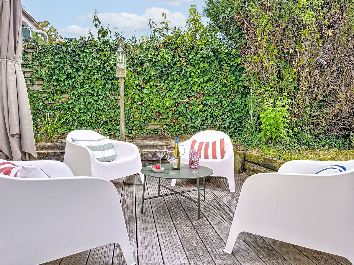 Terrasse (40 m2), meubles de jardin, barbecue, parking public possible dans la rue.