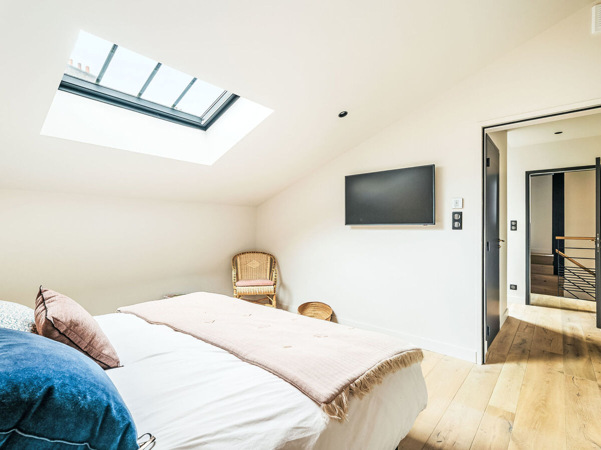 À l'étage supérieur: 1 chambre avec 1 lit (180 cm, longueur 200 cm), 1 x 2 lits superposés (90 cm, longueur 190 cm), TV (écran plat).