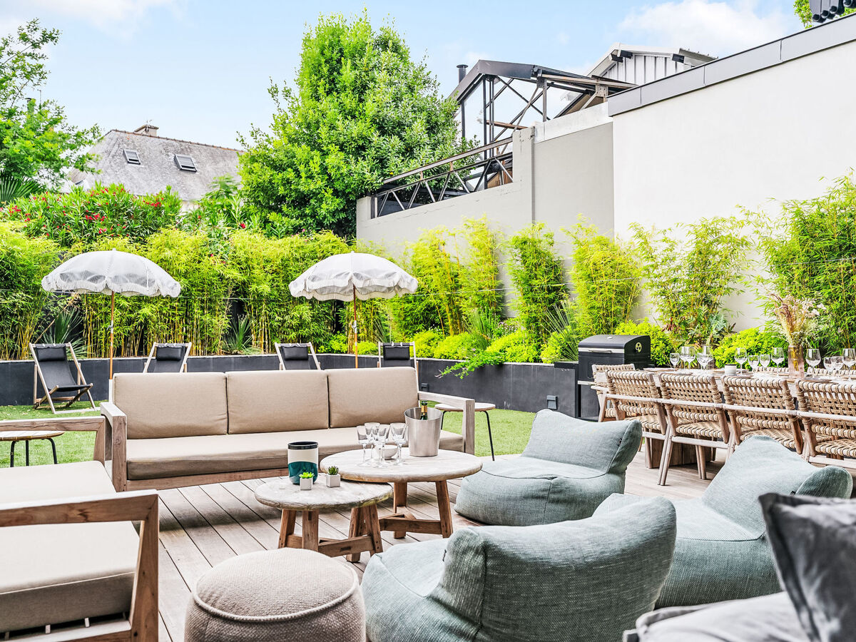 Meubles de terrasse, barbecue, chaises longues.