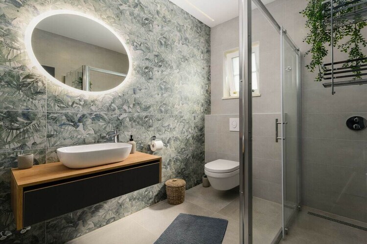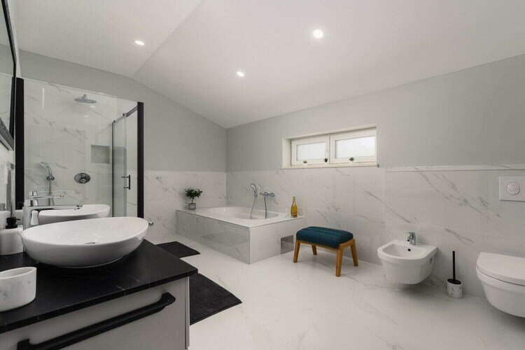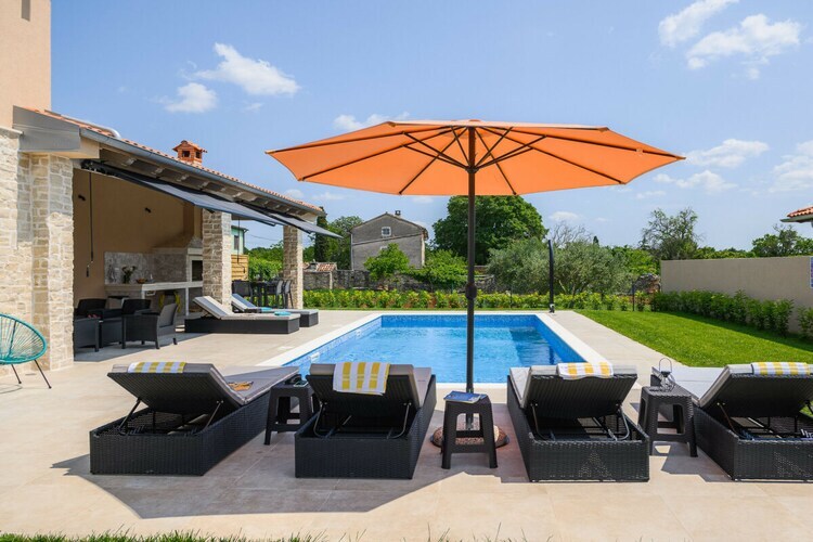 Des toilettes séparées se trouvent également au rez-de-chaussée. À l'étage, une autre chambre ouverte avec un lit double et un balcon donnant sur la piscine et le jardin. La grande salle de bain moderne est équipée d'une douche et d'une baignoire. Le grand espace extérieur, doté d'une cuisine extérieure et d'un grand barbecue, est idéal pour profiter de dîners en plein air au bord de la piscine, accompagnés d'un verre de vin d'Istrie.