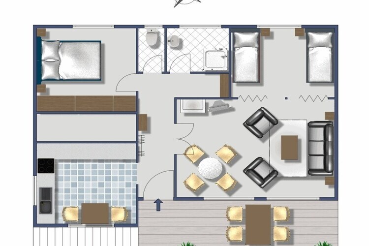 L'appartement de vacances comprend deux chambres et un canapé-lit dans le salon. La cuisine séparée est entièrement équipée. Une salle de bain avec douche et des toilettes séparées sont également à votre disposition. L'appartement est équipé de la climatisation réversible.