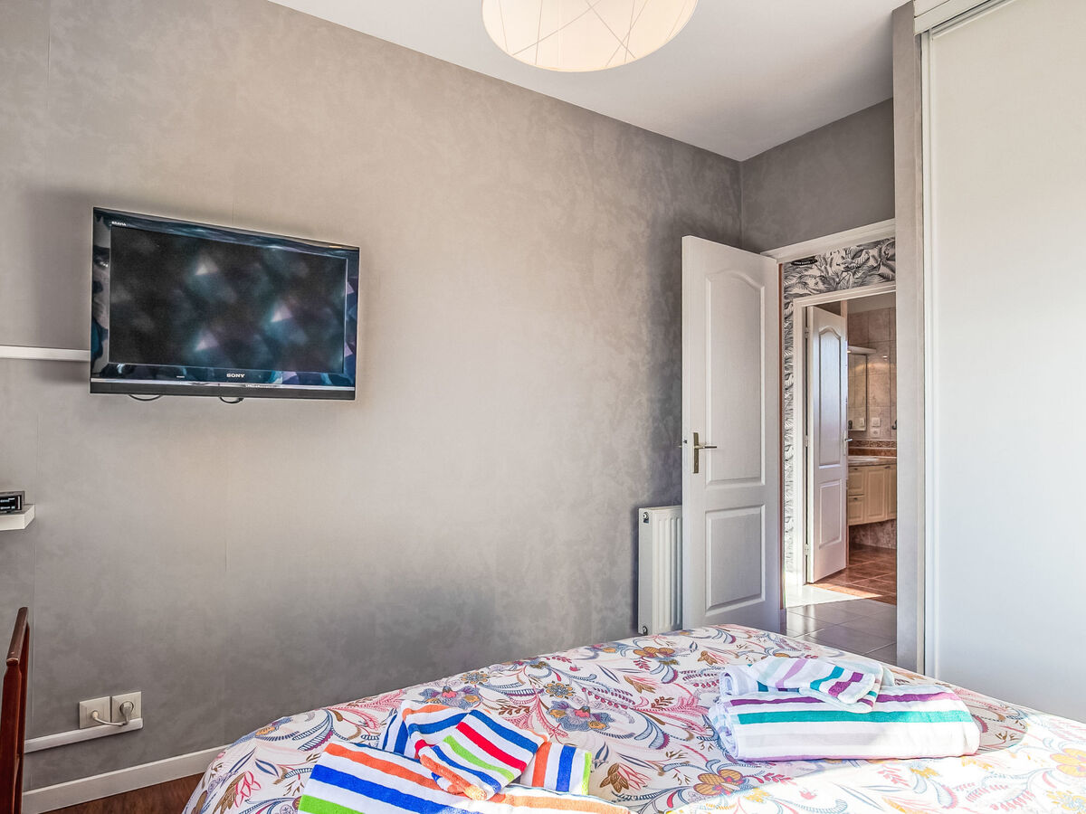 1 chambre avec 1 grand-lit (140 cm, longueur 190 cm), TV et écran plat.